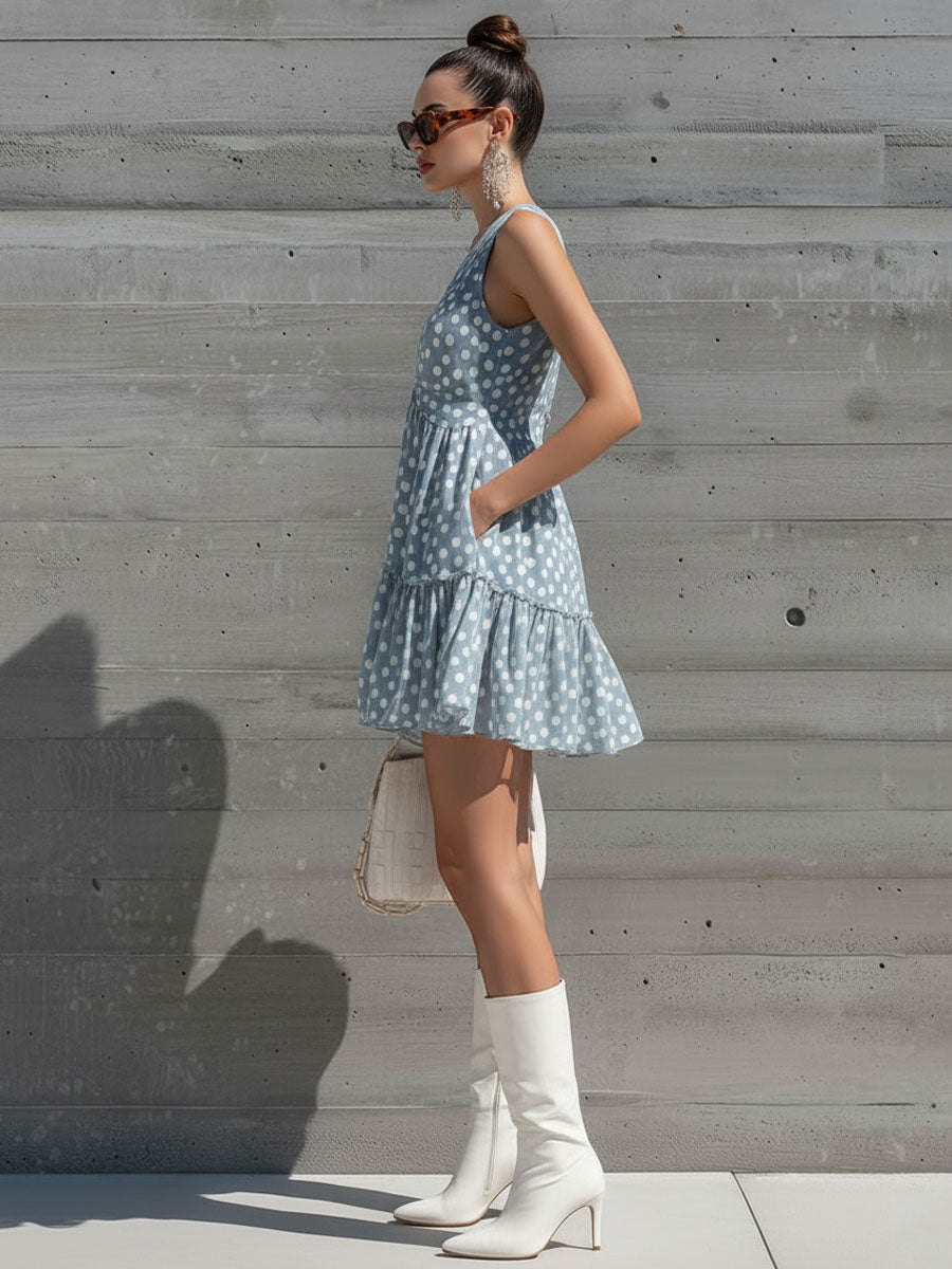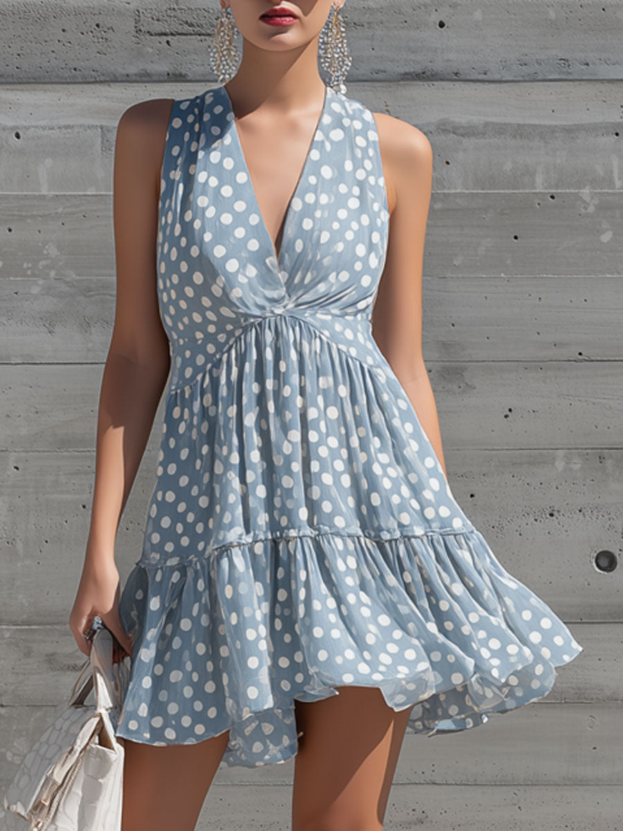 Retro Vacation Polka Dot Gray-blue Chiffon Sleeveless Ruffle Mini Dress