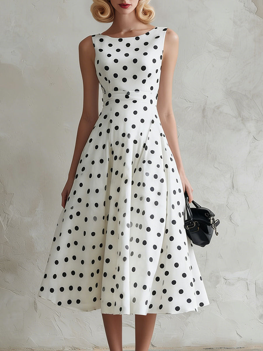 Fashionable Retro Black Polka Dot White Chiffon A-line Sleeveless Midi Dress