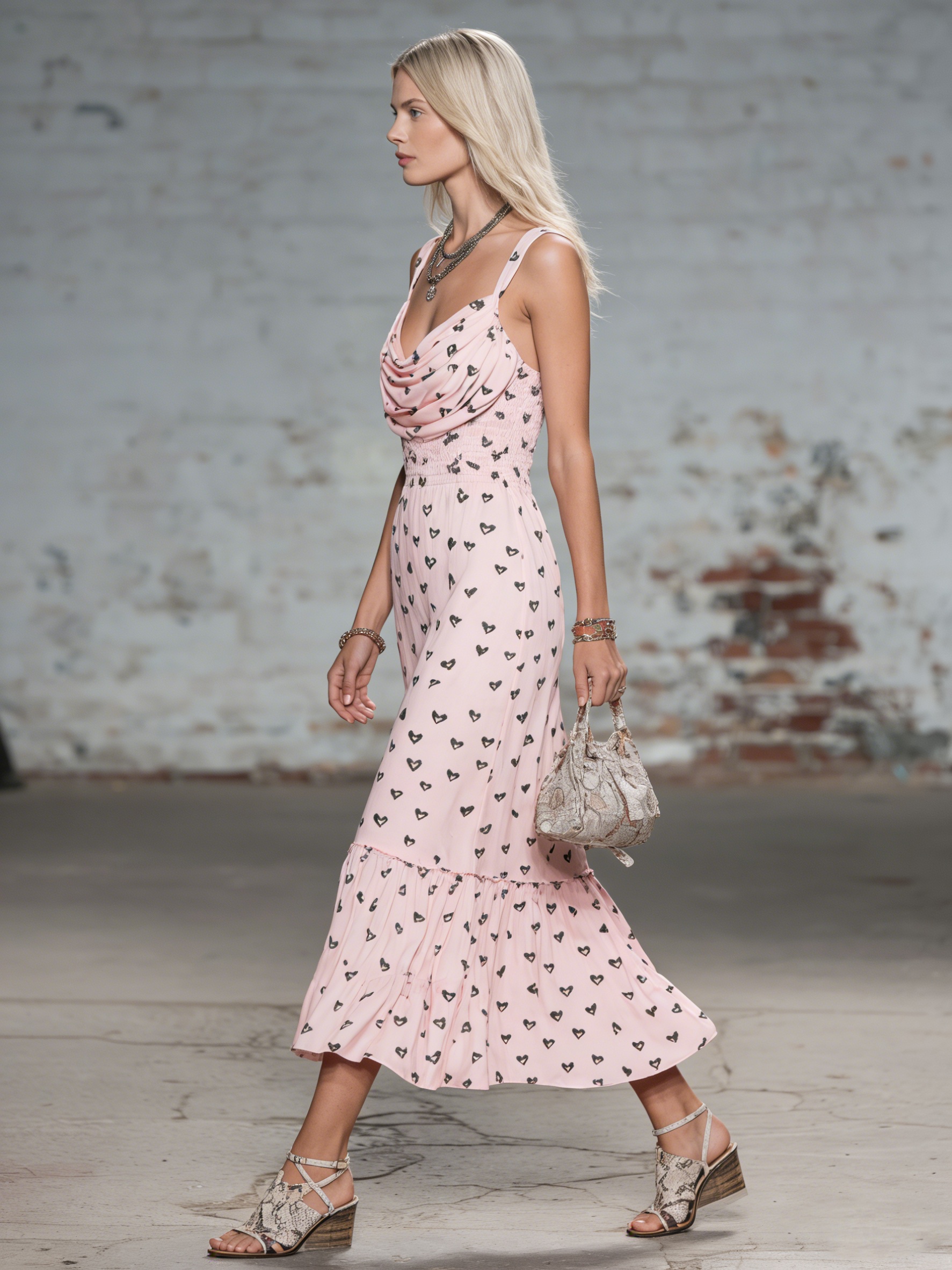 Elegant Stylish Draped-Neck Ruffled Heart-Print Chiffon Midi Dress