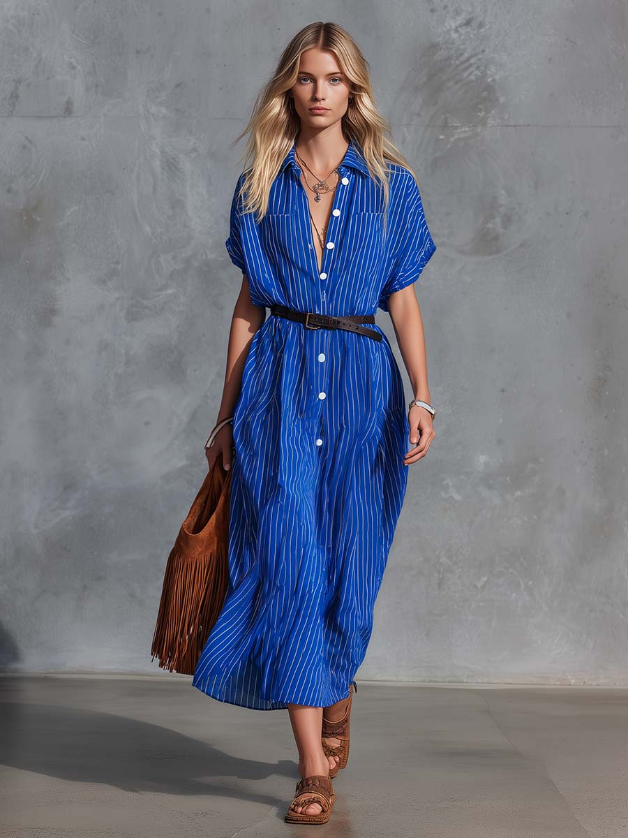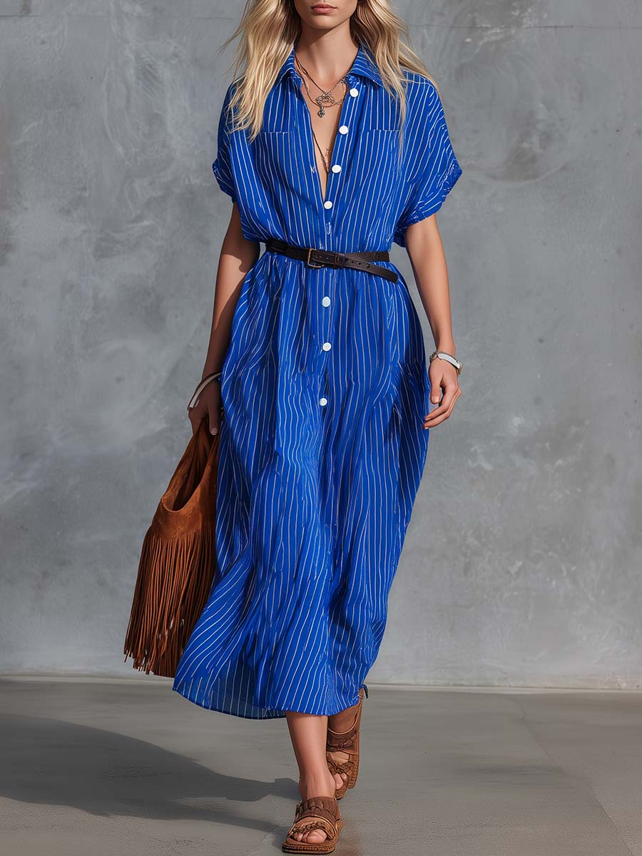 Retro Western Resort V-neck Front Button Royal Blue Striped Chiffon Shirt Dress