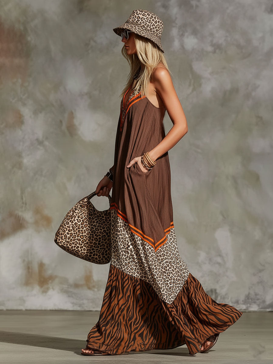 Vacation Retro Leopard Print Zebra Brown Chiffon V-Neck Lace Sleeveless Maxi Dress
