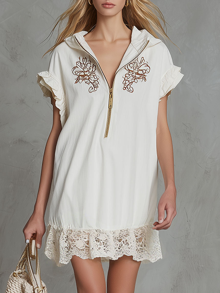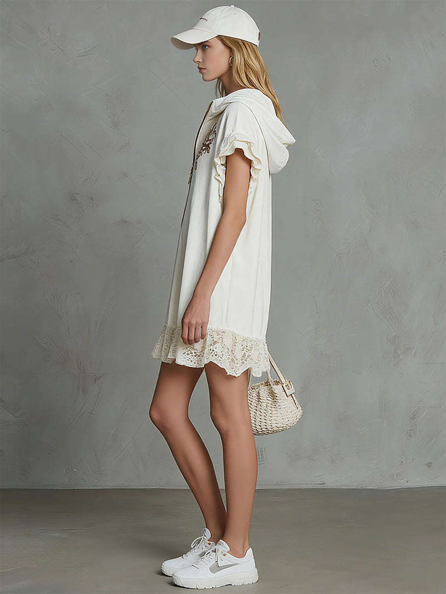 Casual Retro Embroidered Lace White Hooded Short-sleeved Cotton Linen Mini Dress