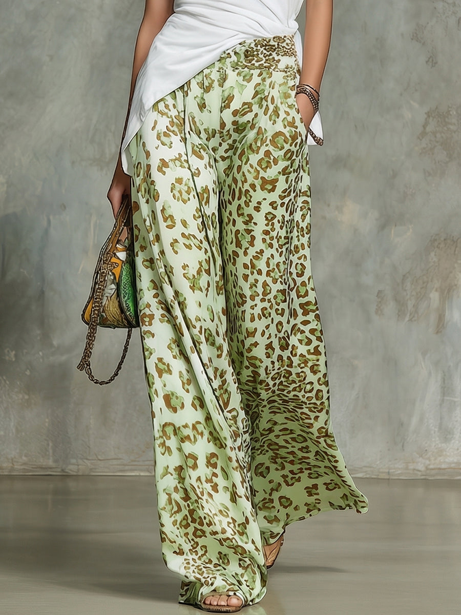 Paired with the statement-making leopard-print chiffon wide-leg pants, this set brings a dynamic and fashion-forward element to your wardrobe. The wide-leg design provides a graceful flow and ease of movement, while the lightweight chiffon fabric offers an air of femininity and breezy comfort. This pairing is ideal for those who love to make a style statement with minimal effort. Dress up the ensemble with heeled sandals and a clutch for an evening outing, or keep it casual with flat sandals and a tote for a daytime look. This set is perfect for those who appreciate a mix of casual charm and bold prints, offering versatility and flair in one cohesive look.