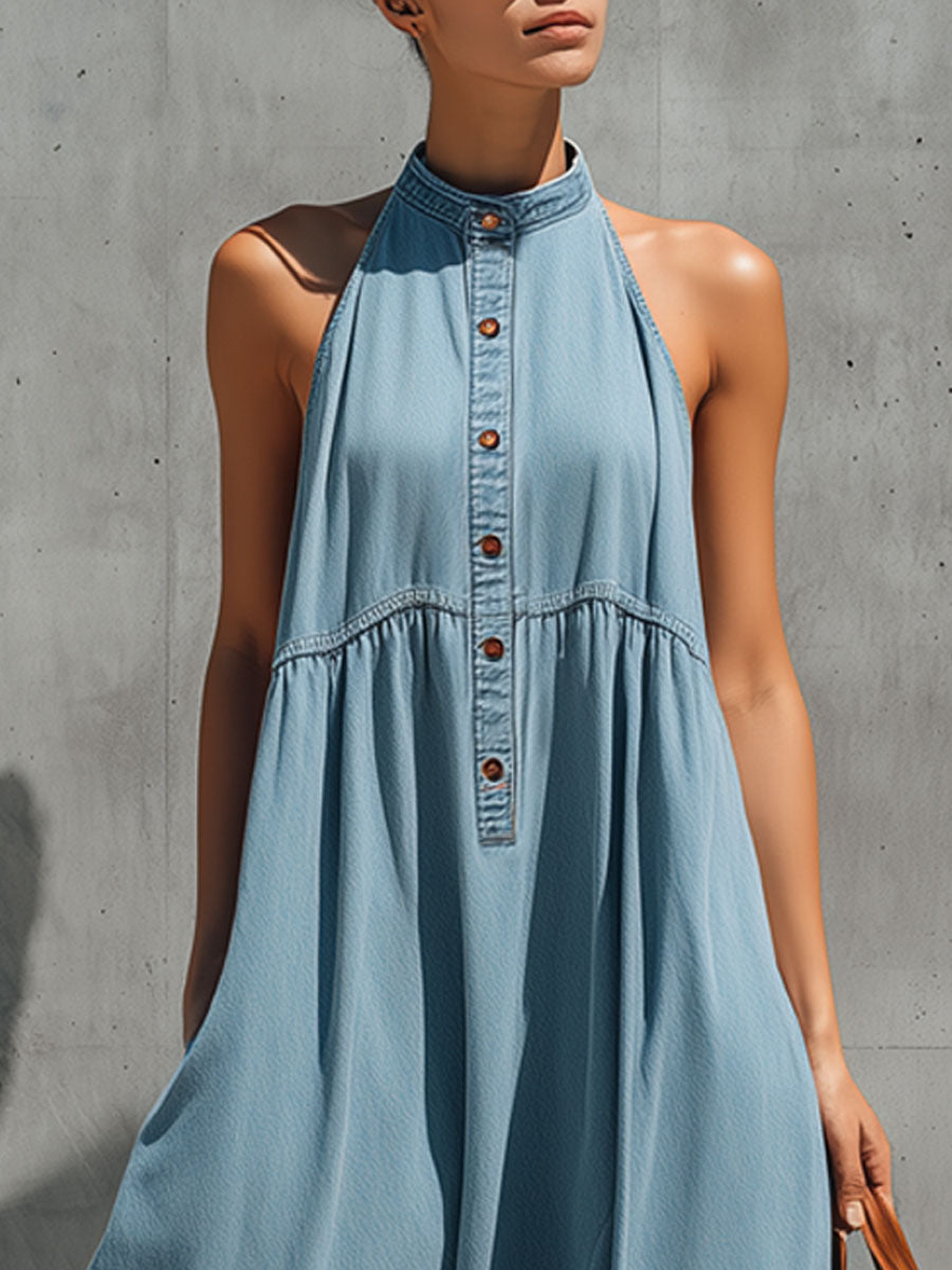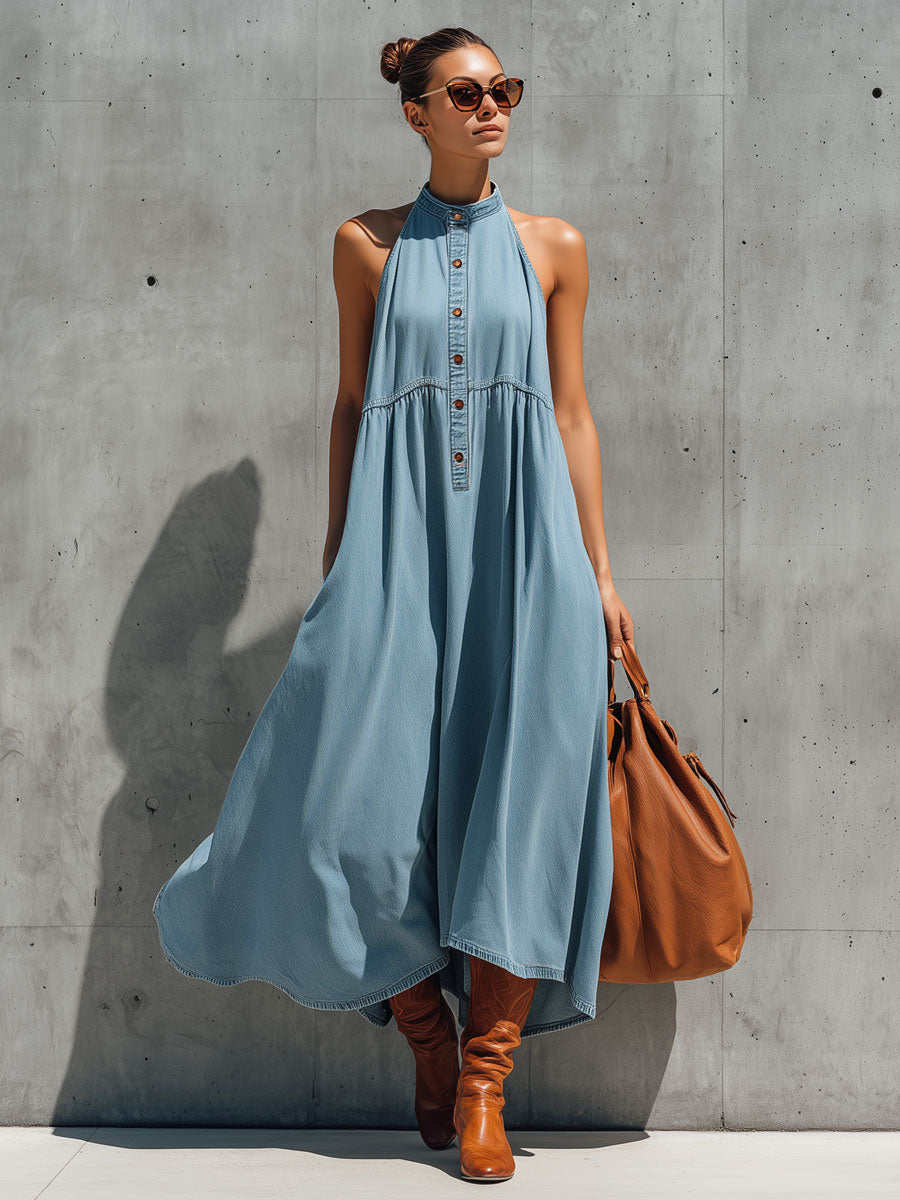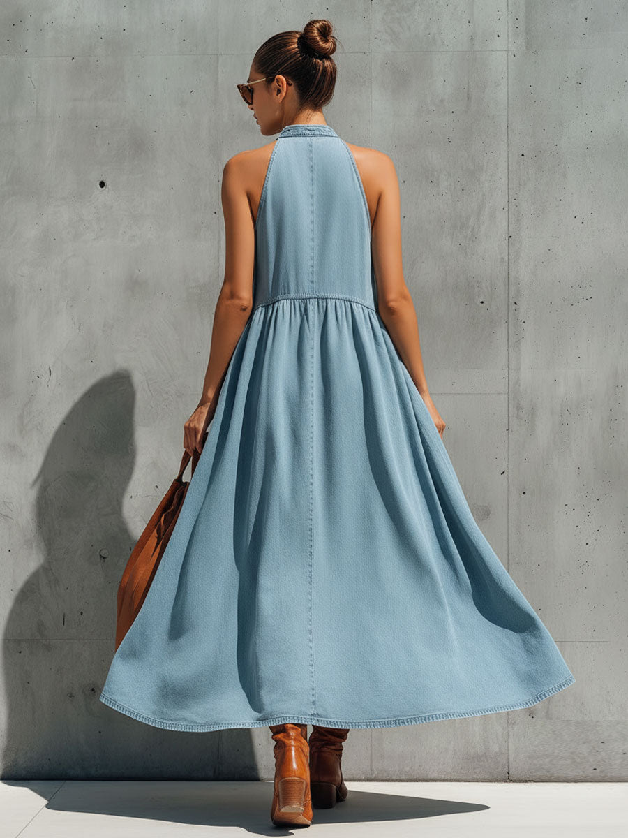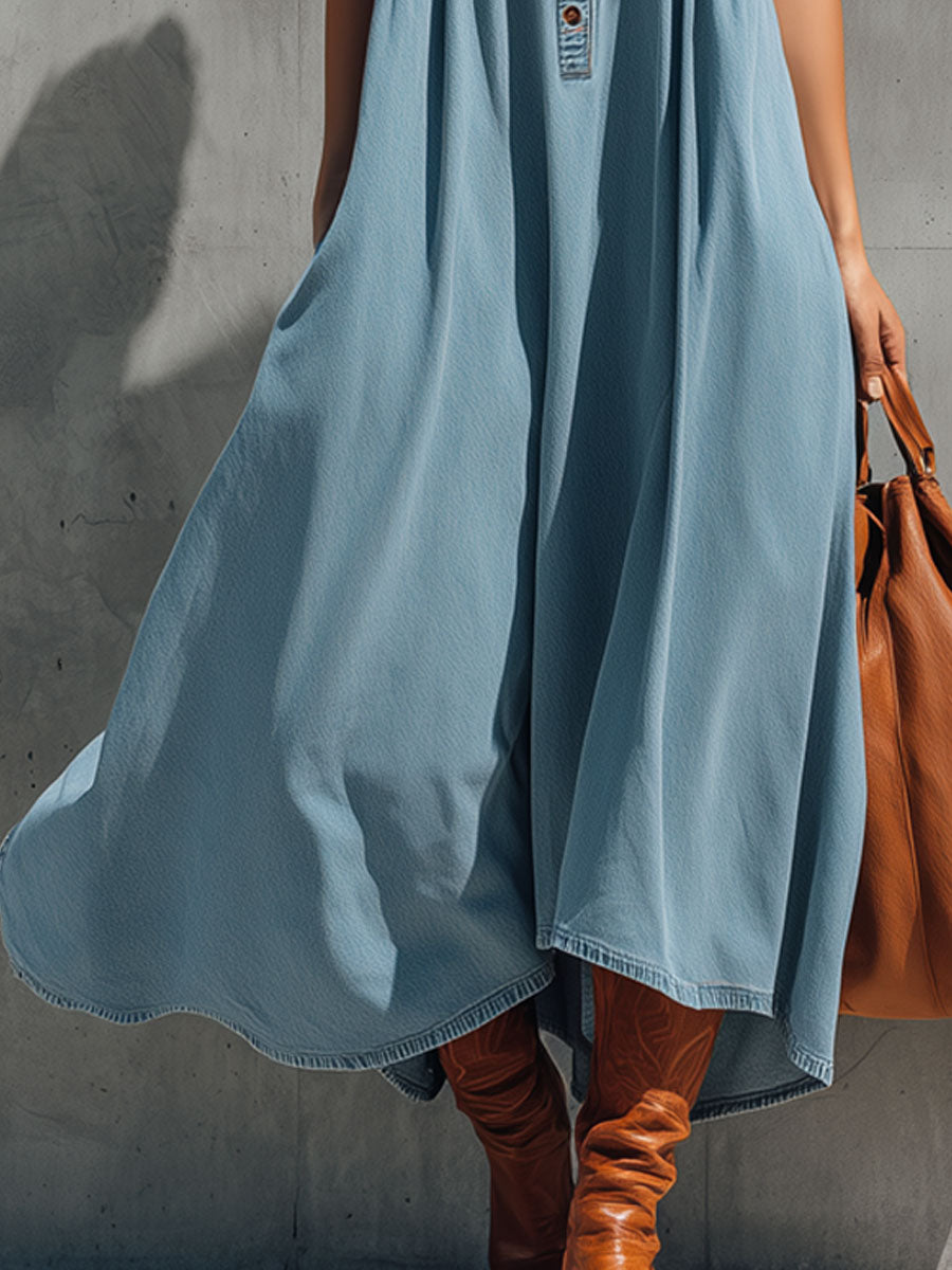 Casual Retro Blue Denim Sleeveless A-line Maxi Dress