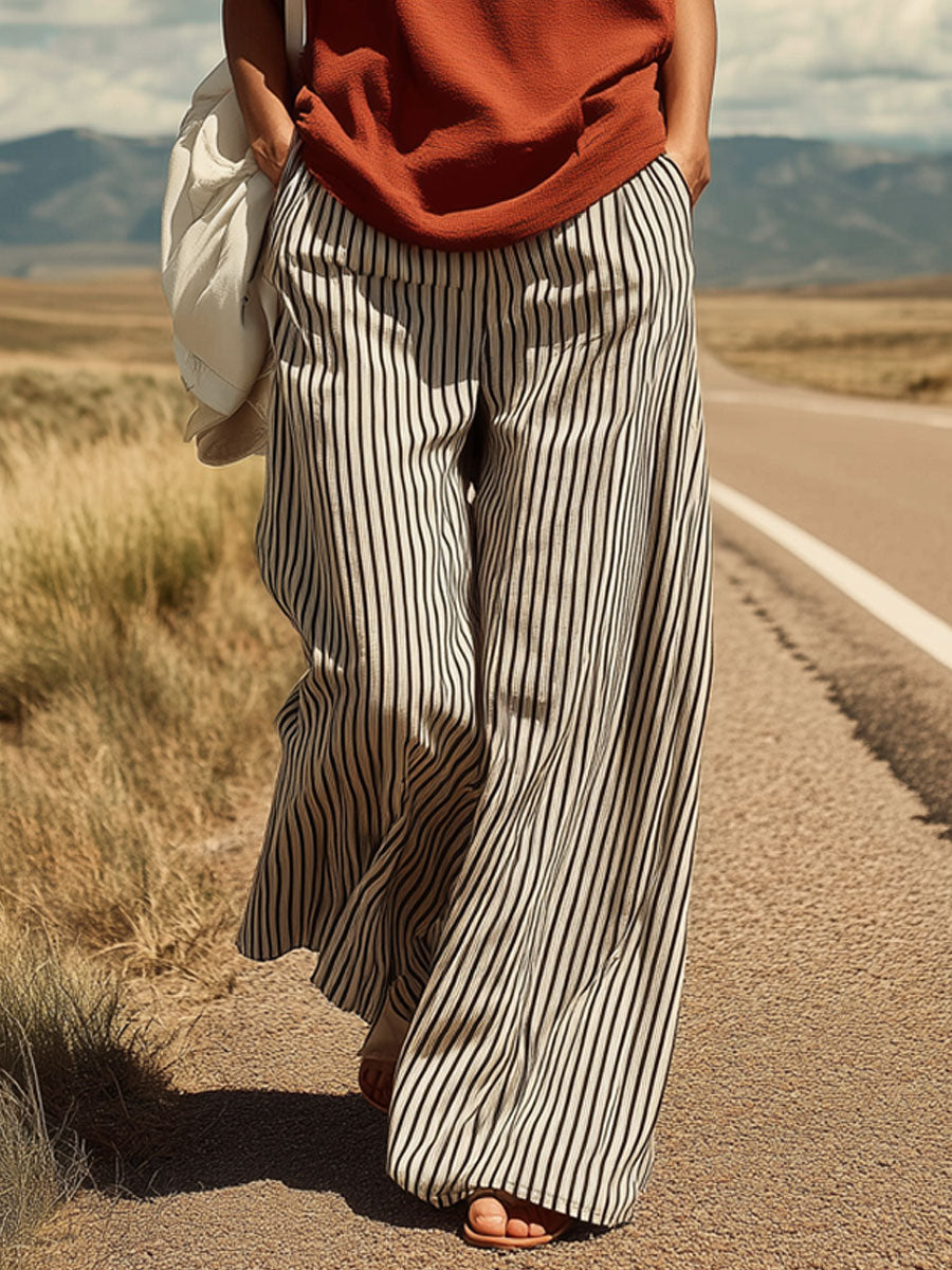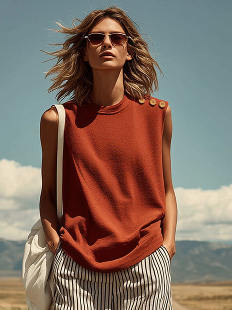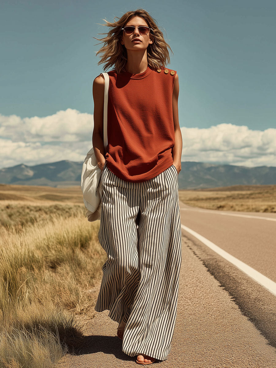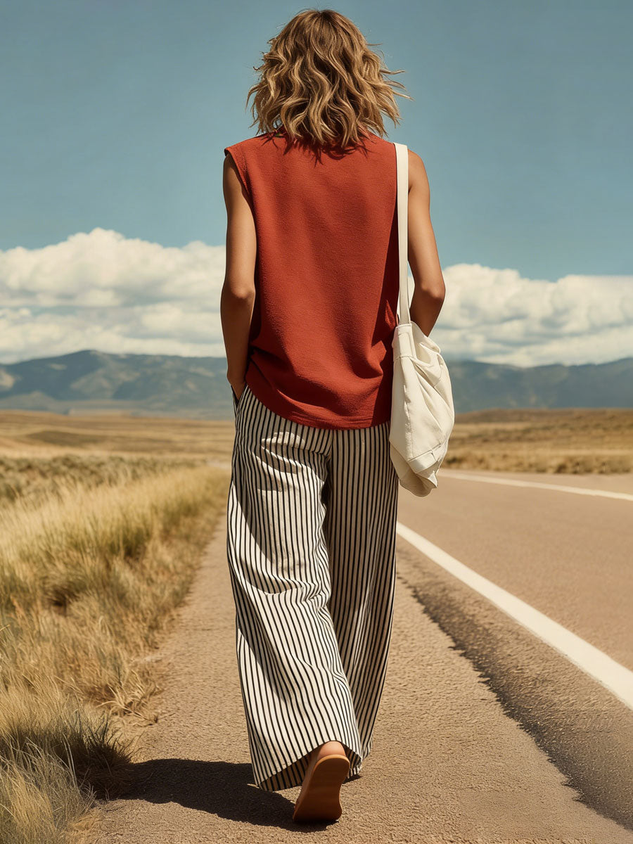 Casual Retro Sleeveless Brick Red Cotton T-Shirt And Striped Cotton Linen Pants Set