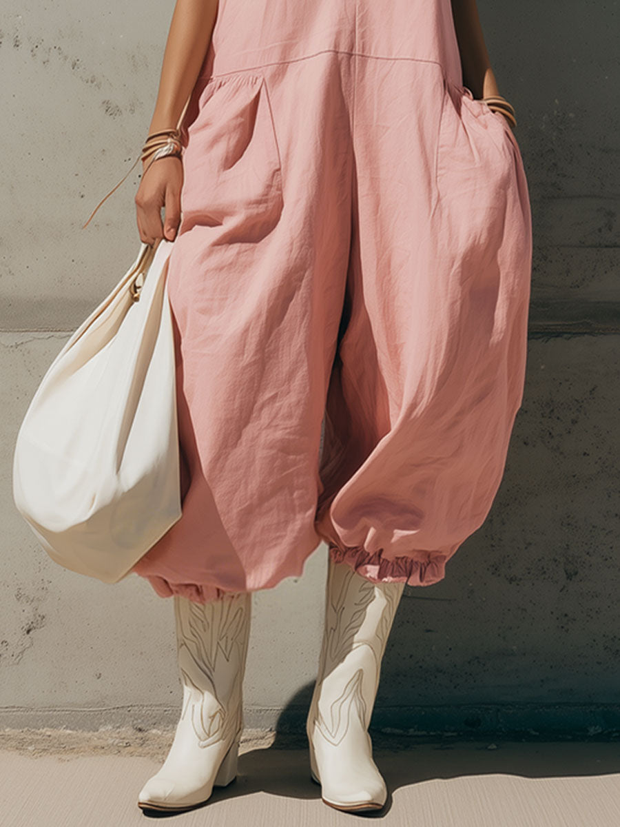 To style this jumpsuit, consider accessories that complement its retro and feminine vibe. For footwear, opt for white sneakers or espadrille wedges to keep the look casual yet chic. A wide-brimmed hat or a floppy sun hat can add a stylish touch while providing sun protection. Minimalist jewelry, such as delicate necklaces or stud earrings, can enhance the outfit without overwhelming it. A crossbody bag or a woven tote can complete the ensemble, making this pink cotton linen jumpsuit perfect for brunches, garden parties, or casual outings. This piece offers a stylish and comfortable way to embrace casual retro fashion with a touch of elegance.