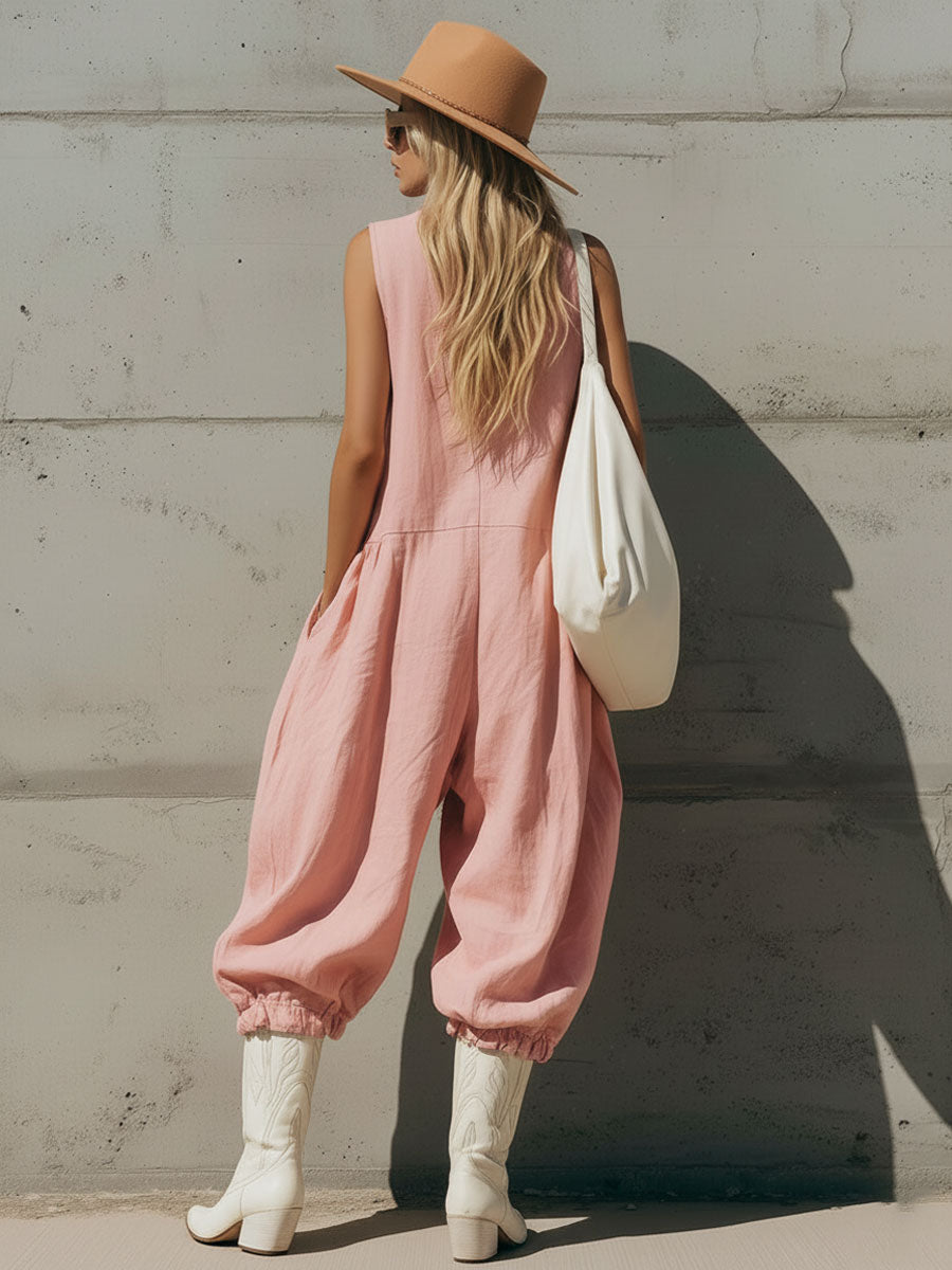 Casual Retro V-neck Lace Sleeveless Pink Cotton Linen Ruffle Jumpsuit