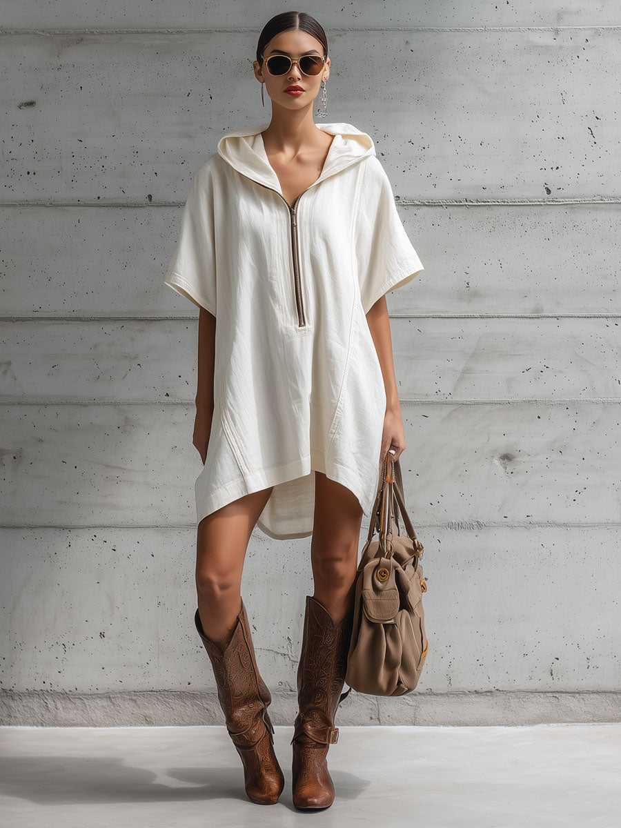 Casual Retro White Cotton Linen Short-sleeved Hooded Mini Dress