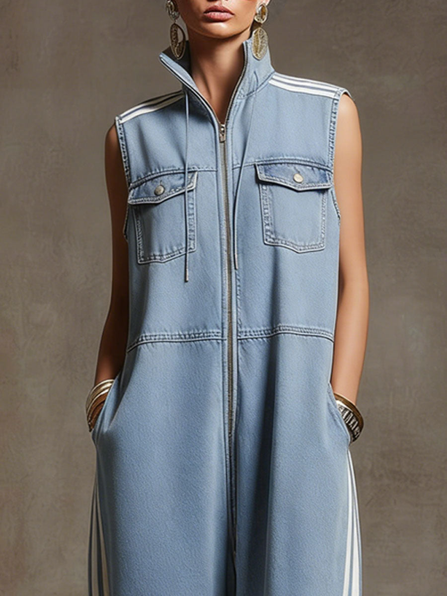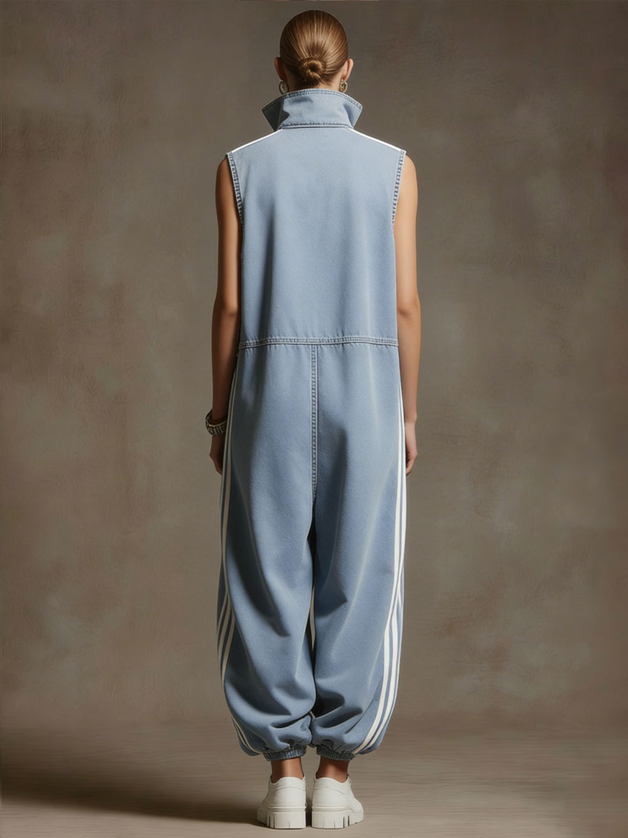 The casual retro white ribbon light blue denim sleeveless jumpsuit is a playful and stylish piece that combines vintage charm with modern comfort. This jumpsuit features a sleeveless design, perfect for warm weather, and is crafted from light blue denim that offers a classic and versatile look. The addition of a white ribbon detail adds a touch of femininity and retro flair, creating a unique focal point that elevates the overall design. The jumpsuit's relaxed fit ensures ease of movement, making it an ideal choice for casual outings.