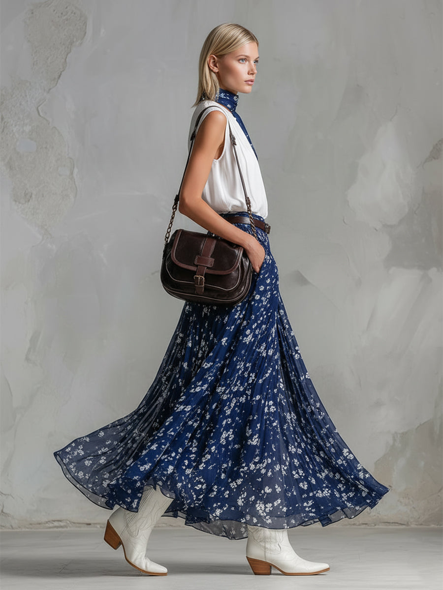 This is a fresh and charmingly feminine two-piece ensemble: a classic white sleeveless top paired with a flowing chiffon skirt featuring a soft, blue, scarf-style floral print. The top boasts a clean, crisp, minimalist silhouette that cleverly balances the skirt's romantic movement and intricate print details, creating an effortlessly chic aesthetic. It is the perfect choice for a variety of occasions—whether attending daytime events, enjoying a leisurely vacation, or dining out on a summer evening.