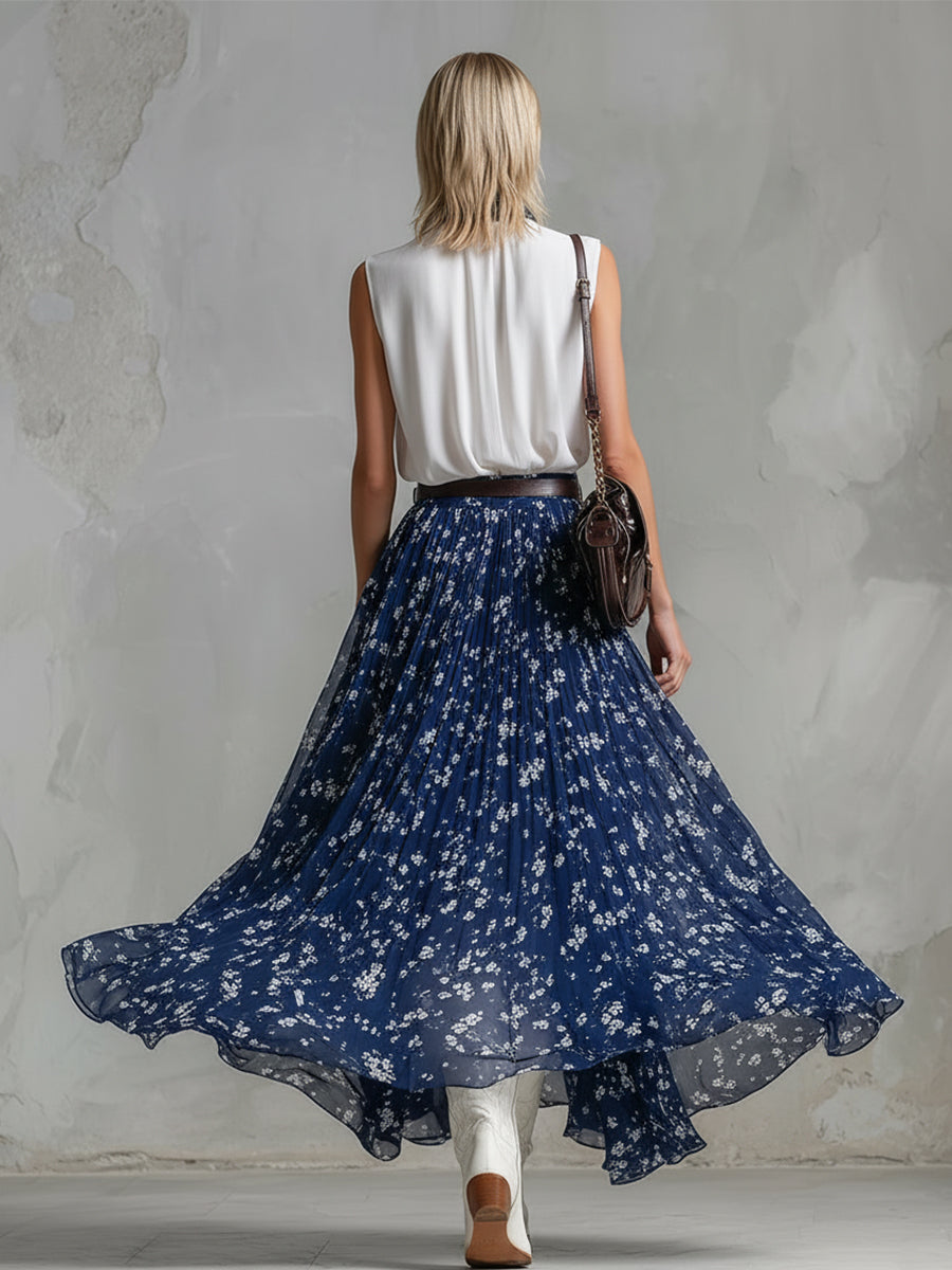 Classic White Sleeveless Top & Blue Floral Silk Scarf-Print Chiffon Skirt Set