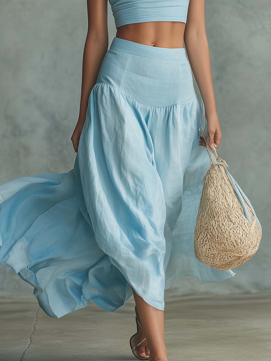 Elegant Flowy Light Blue Hort-Sleeve T-Shirt And Cotton-Linen Low-Waist Skirt Set