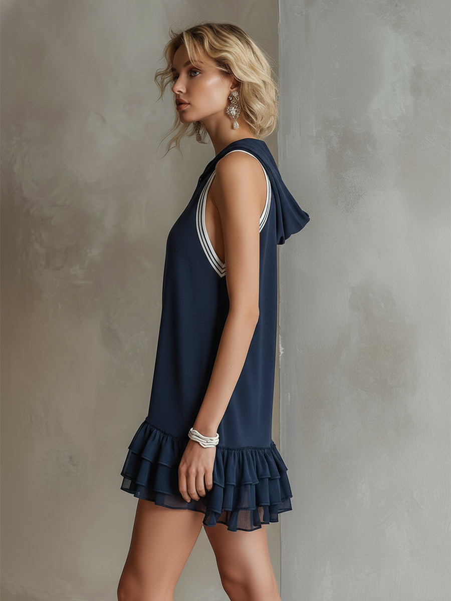 Elegant Sporty Chiffon Ruffled Dark Blue Cotton Hooded Sleeveless Mini Dress