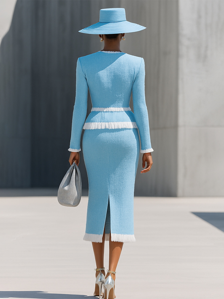 The coordinating skirt, usually high-waisted and cut in a flattering A-line or pencil style, mirrors the top's intricate details for a cohesive and elegant look. Fringe or tassel accents on the hem offer fluidity and charm, while the tweed fabric ensures structure and sophistication. Perfect for special occasions, high teas, or stylish office settings, this set pairs beautifully with classic pumps, pearl accessories, and a mini handbag for a truly vintage-inspired ensemble with a modern twist.