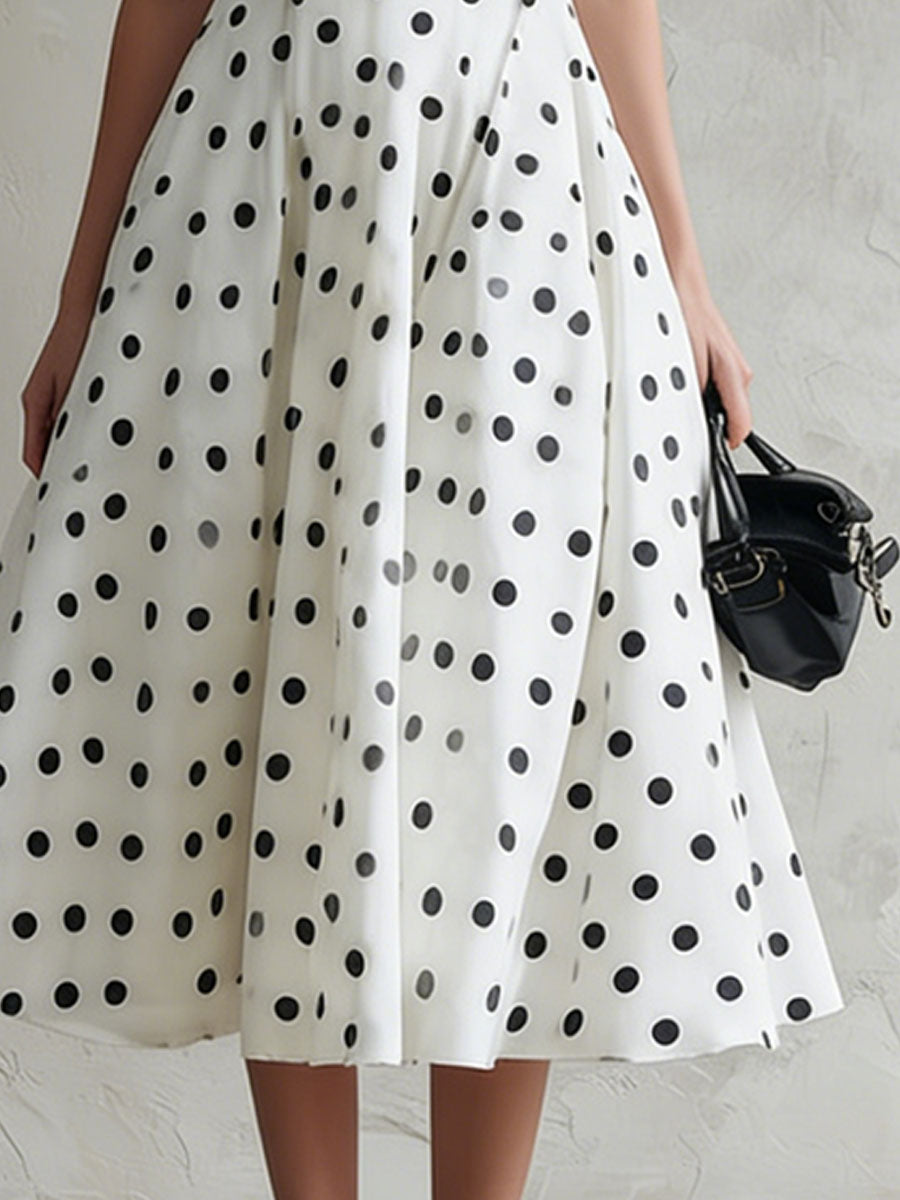 Fashionable Retro Black Polka Dot White Chiffon A-line Sleeveless Midi Dress