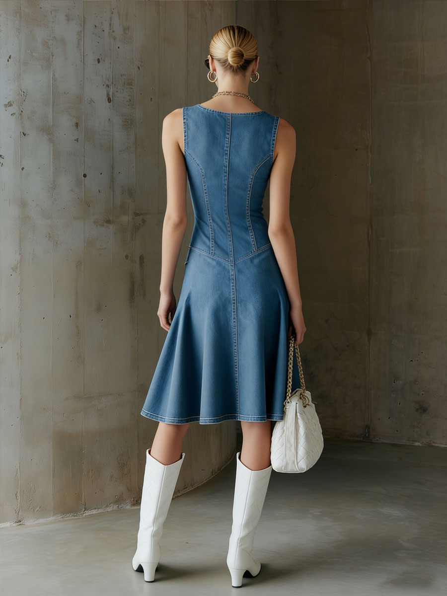 Fashionable Retro Blue Denim V-neck Sleeveless A-line Midi Dress