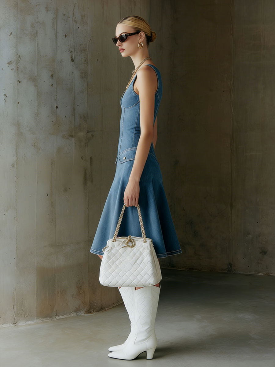 The fashionable retro blue denim V-neck sleeveless A-line midi dress is a versatile and chic piece that effortlessly blends casual denim with a classic silhouette. The blue denim fabric provides a timeless and durable look, while the V-neckline adds a touch of elegance. The A-line cut flatters various body types, offering a comfortable and stylish fit that falls to a midi length, perfect for both casual and semi-formal occasions.