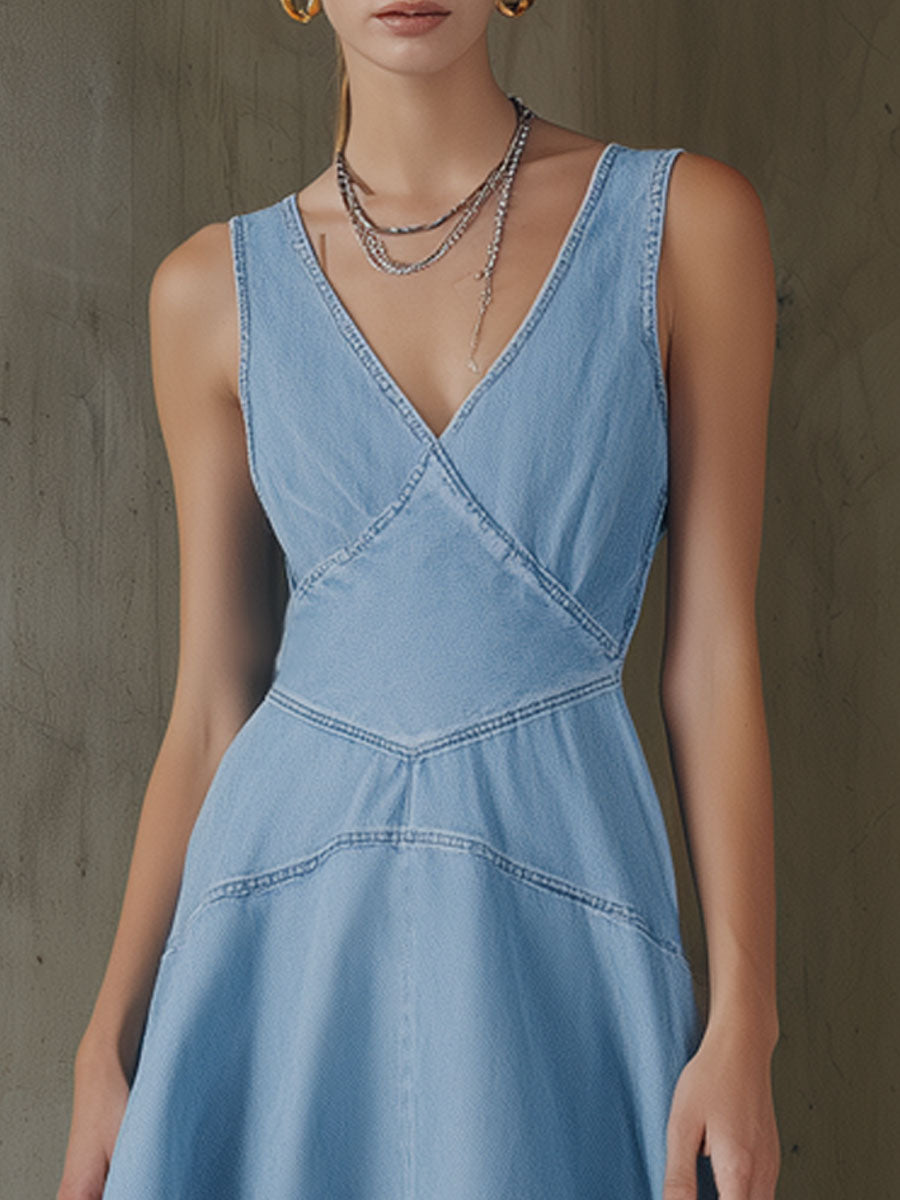 Fashionable Retro Light Blue Denim V-neck Sleeveless Irregular A-line Midi Dress