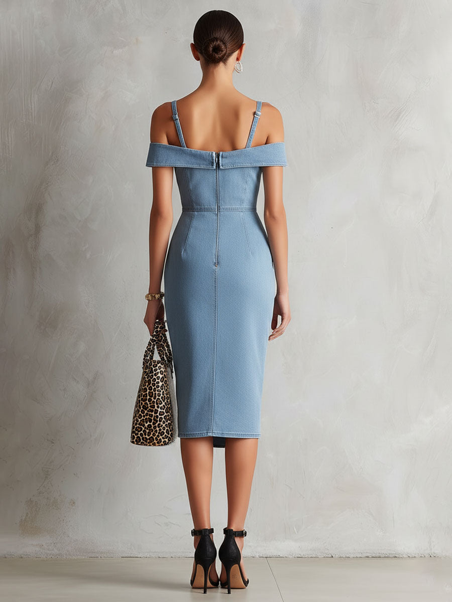 Fashionable Retro Sleeveless Off-shoulder Slit Light Blue Denim Midi Dress