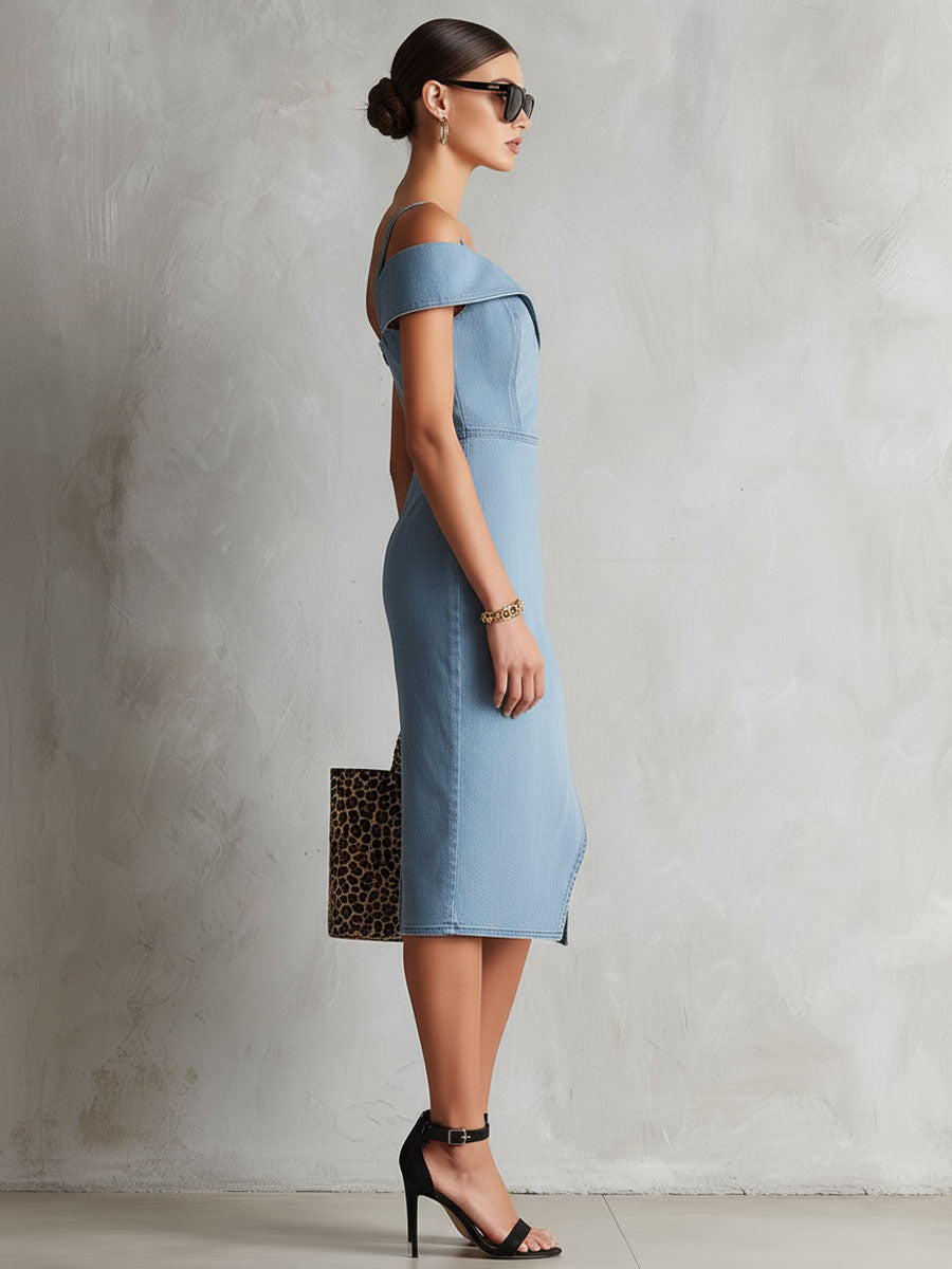 The fashionable retro sleeveless off-shoulder slit light blue denim midi dress is a chic and versatile piece that combines classic denim with a modern silhouette. Made from light blue denim, this dress offers a structured yet comfortable fit, perfect for various occasions. The off-shoulder design adds a touch of elegance and femininity, while the sleeveless cut keeps it cool and breezy. The midi length provides a sophisticated look, and the side slit introduces a hint of allure and ease of movement.