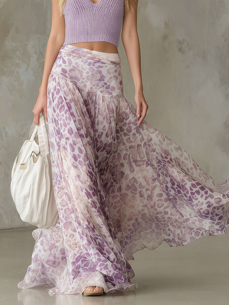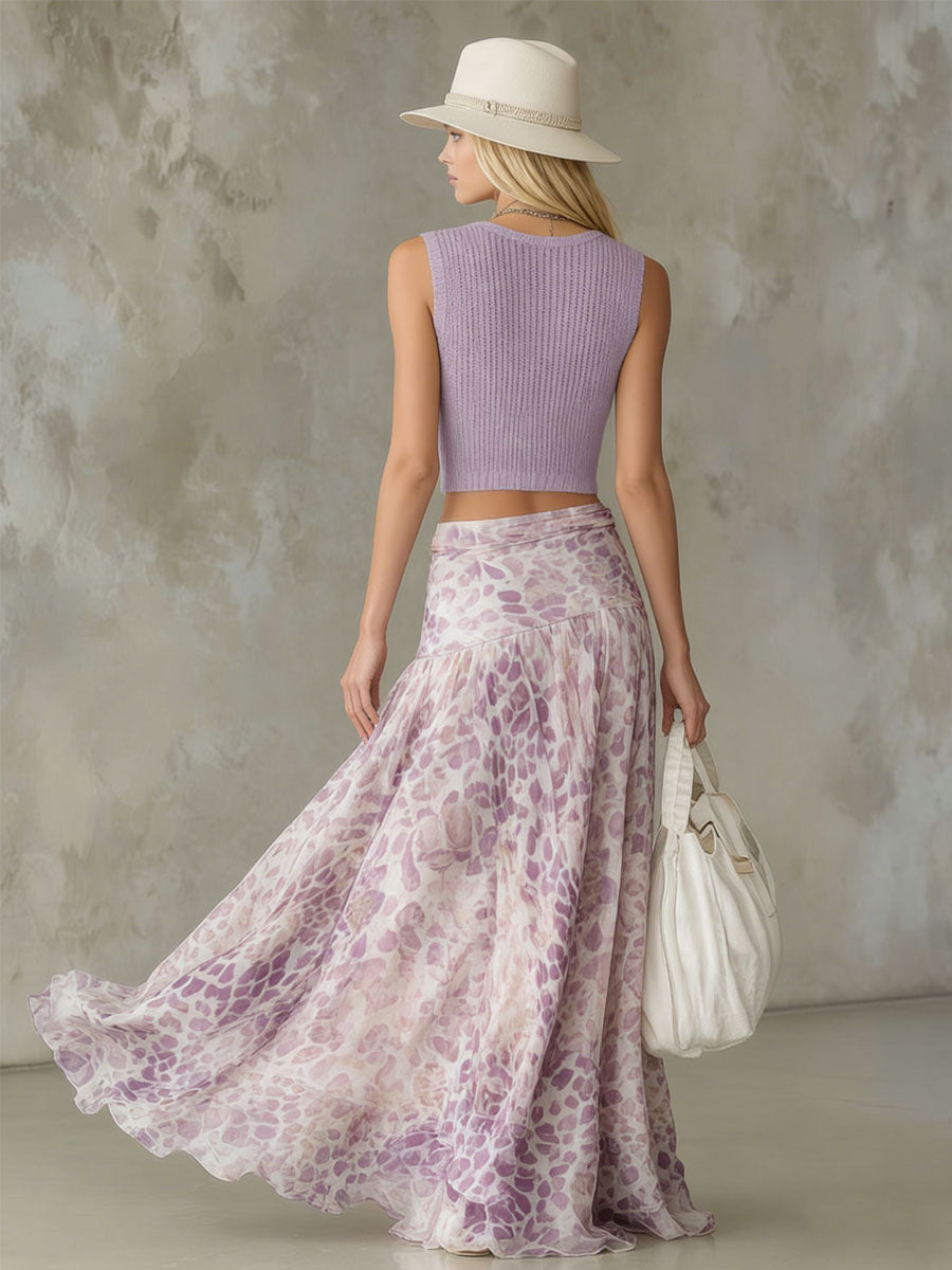 Fitted V-neck Sleeveless Knit Top And Leopard Print Chiffon Skirt Set