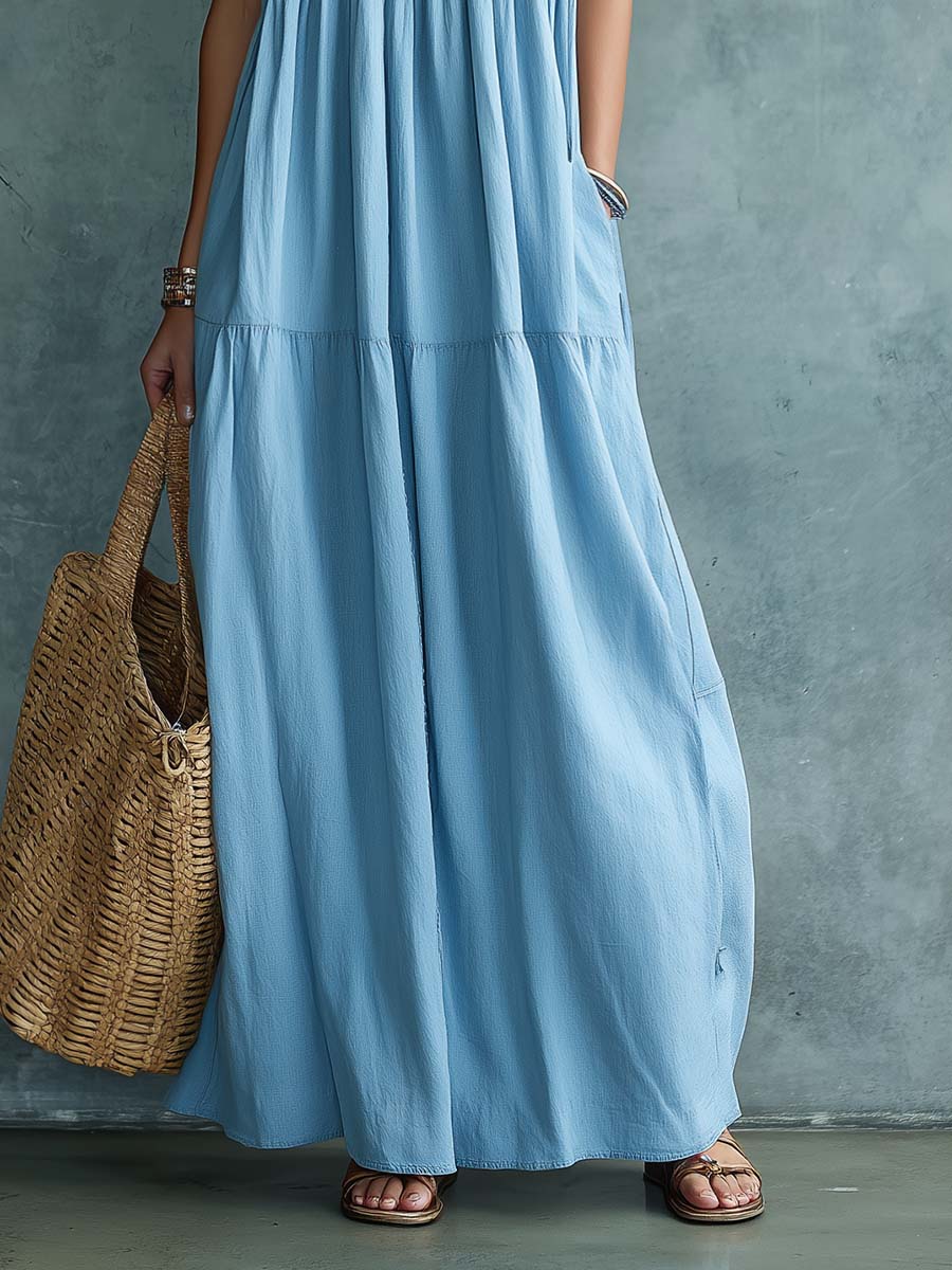 Retro Bohemian Vacation Light Blue Cotton Linen Camisole Maxi Dress
