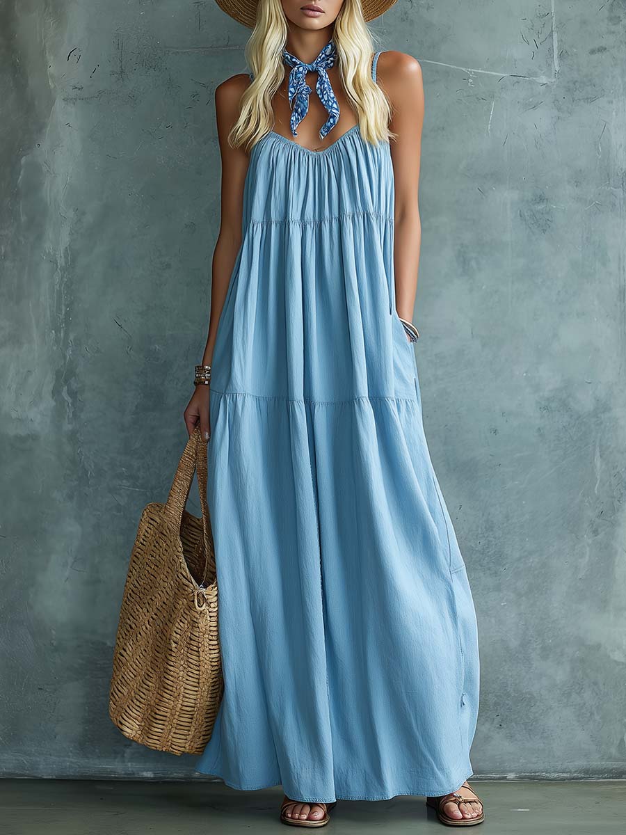 This light blue camisole maxi dress blends retro bohemian charm with breathable cotton-linen comfort. Designed for warm-weather getaways, the dress features a relaxed, flowing silhouette that drapes softly from a simple camisole bodice into a long, airy skirt — perfect for beach strolls, city sightseeing, or relaxed evenings outdoors.