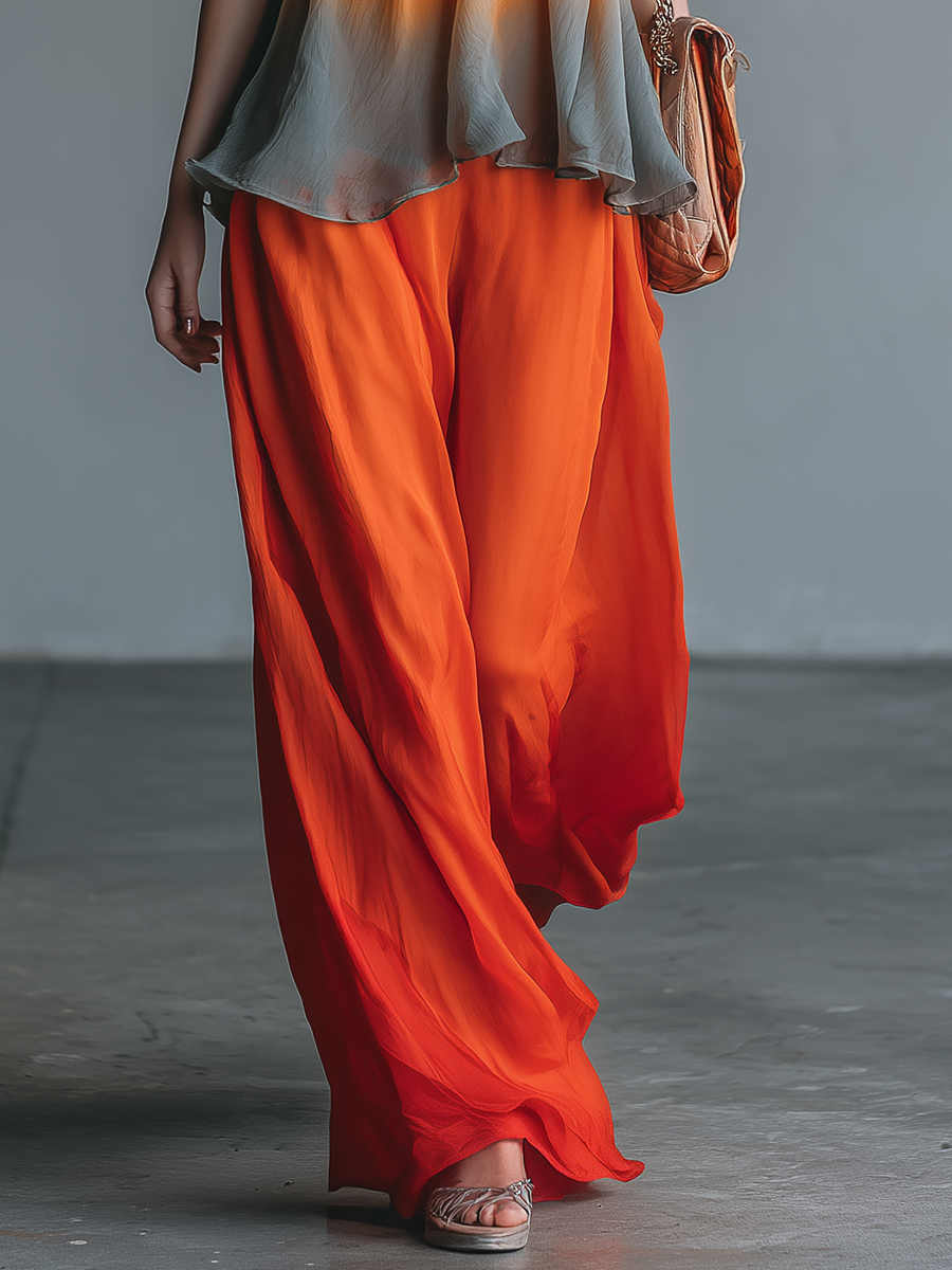 This retro-chic two-piece features a sleeveless A-line gradient top paired with floaty chiffon trousers for vintage-inspired femininity with modern ease. The top skims the body in an A-line silhouette with a soft gradation of color for a faded, sun-washed effect, while the trousers are cut from lightweight printed chiffon with a wide-leg drape and a comfortable elastic/drawstring waistband; trousers are fully or partially lined to ensure opacity. Together they create breezy movement and a flattering, relaxed shape that nods to classic ’60s silhouettes without feeling costume-y.