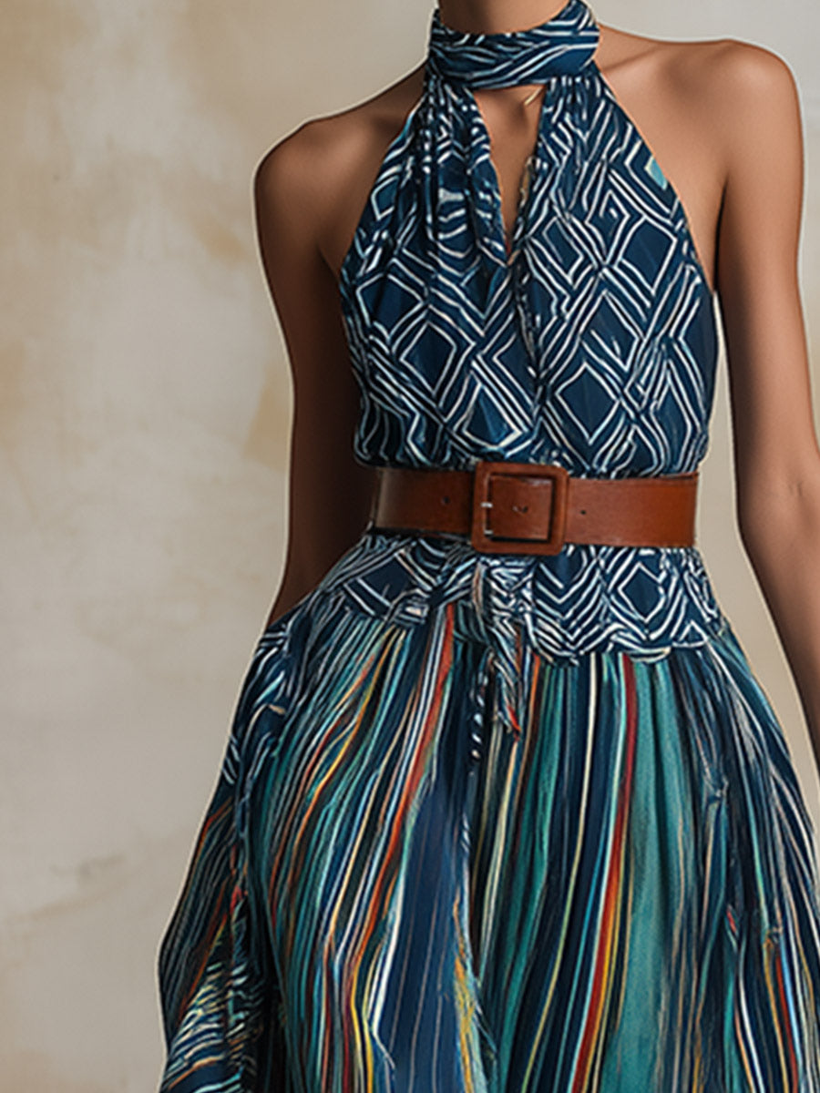 This "Vintage Ethnic-Style Turquoise Abstract Print Chiffon Sleeveless Maxi Dress" is an indispensable, versatile staple for any summer wardrobe, perfectly combining comfortable, breathable fabric with a uniquely distinctive print design. Whether you are vacationing, attending a garden party, or simply enjoying a relaxing evening, it makes for an excellent choice; with just a few simple accessories, you can effortlessly create a variety of looks—ranging from casual chic to refined elegance. If you are seeking a relaxed yet stylish aesthetic infused with a vintage bohemian spirit, this maxi dress is undoubtedly the ideal choice for you.