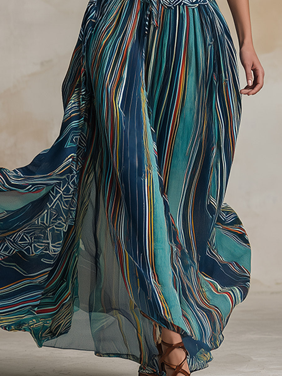 This ethereal and captivating maxi dress creates an unforgettable impression, seamlessly blending vintage ethnic flair with a modern, casual sensibility. Crafted with a lightweight chiffon outer layer paired with a soft inner lining, the dress features an abstract print dominated by turquoise hues. Its fluid, full-length silhouette sways gracefully with every step, creating a truly breathtaking visual effect. Designed specifically for warmer seasons, it offers exceptional comfort and breathability; it exudes a relaxed, effortless vibe without sacrificing an ounce of elegance, making it perfectly suited for everything from daytime outings to evening gatherings.