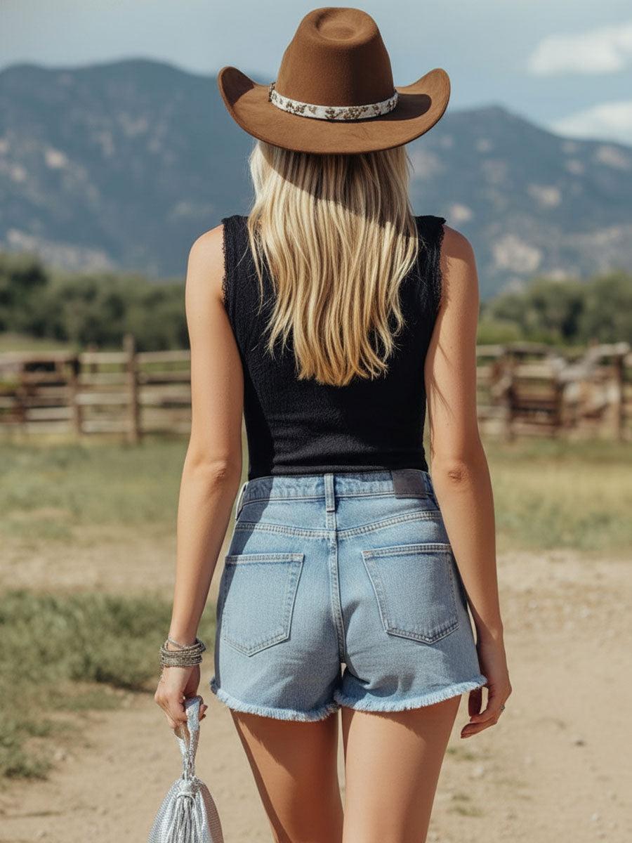 Pair them with a tucked‑in tee or cropped blouse for effortless weekend style, or layer with a lightweight jacket and sneakers for a casual retro look. Durable, versatile, and endlessly wearable — these denim shorts capture that classic vintage spirit with a modern edge.