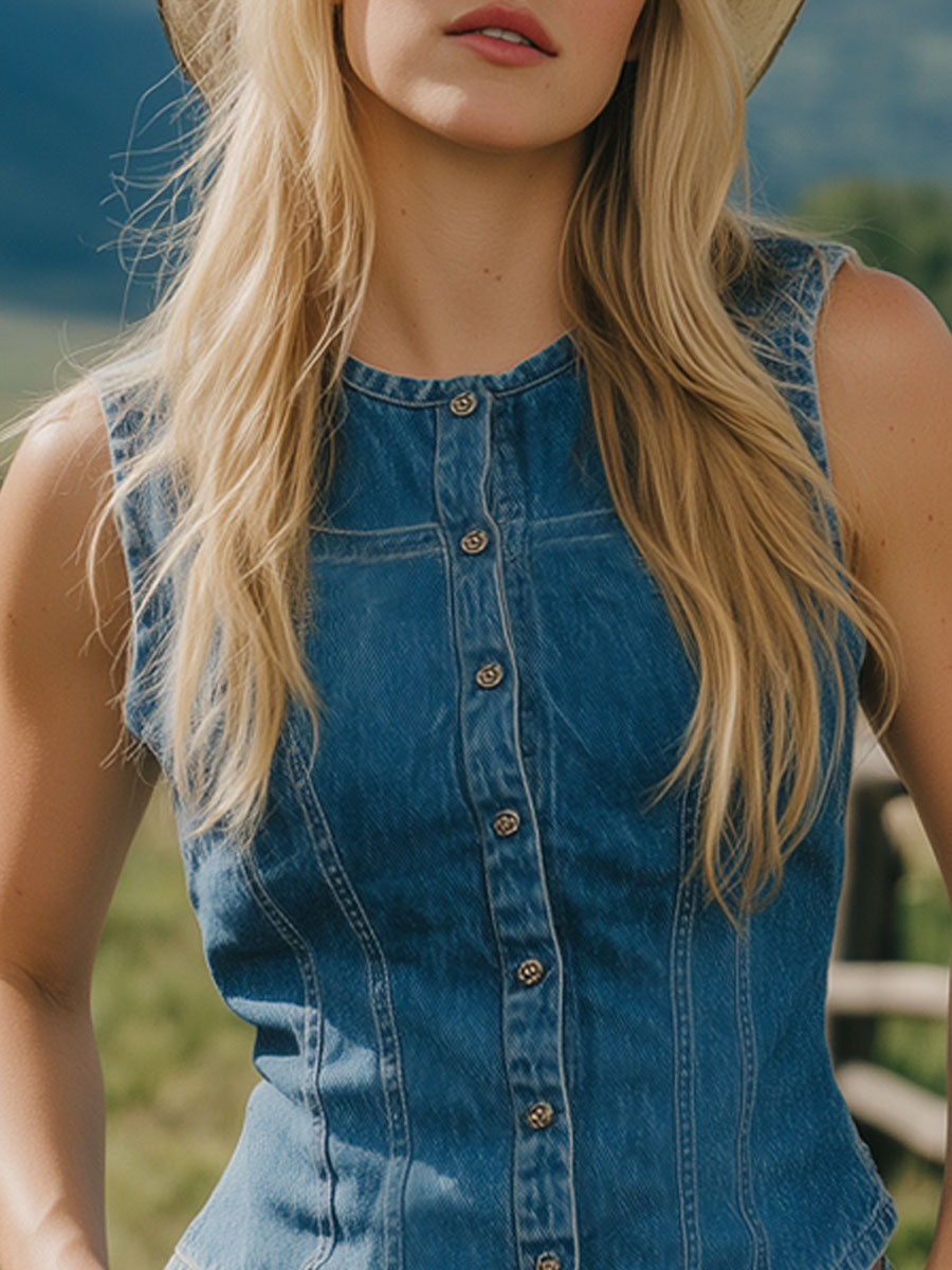 Retro Round Neck Single-breasted Denim Vest