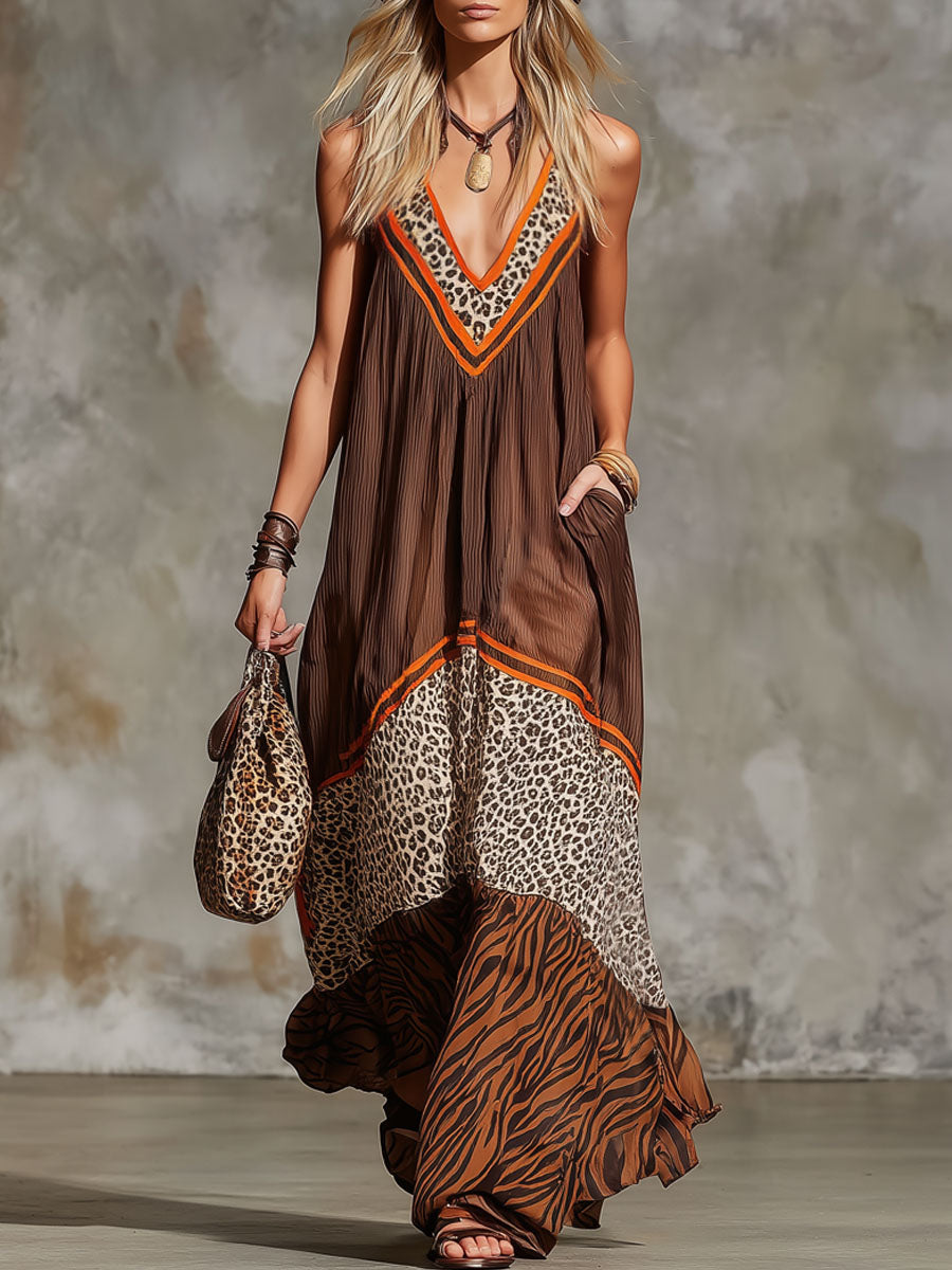 Retro V-neck Color-blocked Animal Print Chiffon Sleeveless Maxi Dress