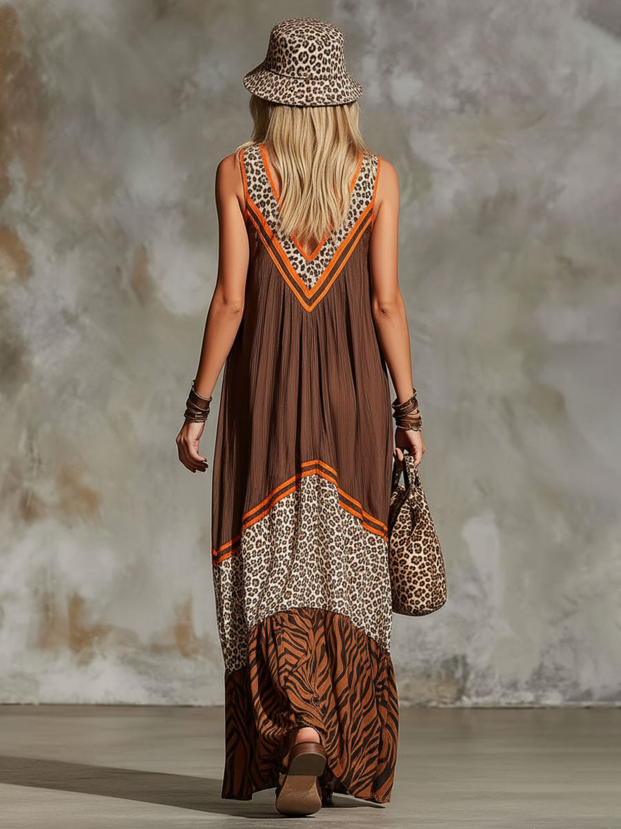 Make a striking statement with our Retro V‑Neck Color‑Blocked Animal Print Chiffon Sleeveless Maxi Dress. Crafted from lightweight, flowy chiffon, this dress drapes beautifully with every step while keeping you cool and comfortable. The V‑neckline elongates the silhouette, and the classic sleeveless cut adds breezy ease. A mix of animal prints and color‑blocked panels evokes retro boho energy, giving the dress depth and bold visual contrast.
