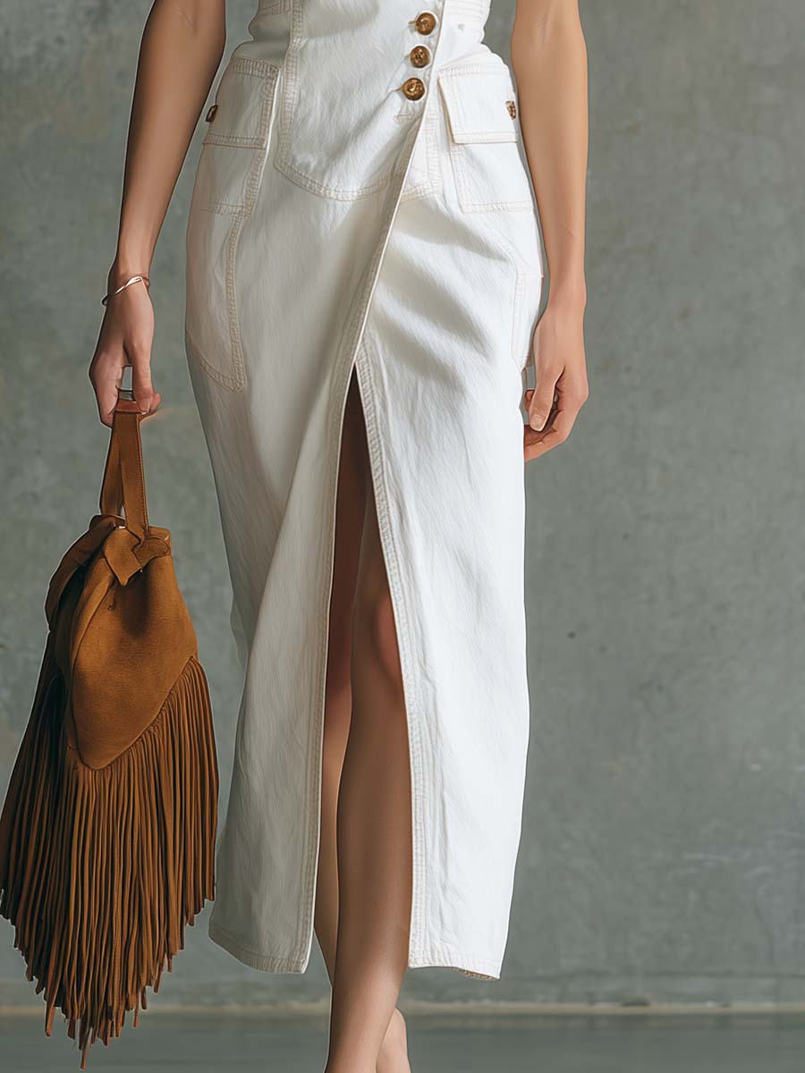 This white denim midi dress combines retro western details with contemporary tailoring. Crafted from structured white denim, it features a classic lapel collar, an eye-catching asymmetrical front placket with exposed buttons, and a tasteful slit at the skirt that enhances movement and adds a subtly flirty finish. The clean, minimalist silhouette and crisp white color make this piece versatile for daytime outings or dressed-up evening looks.