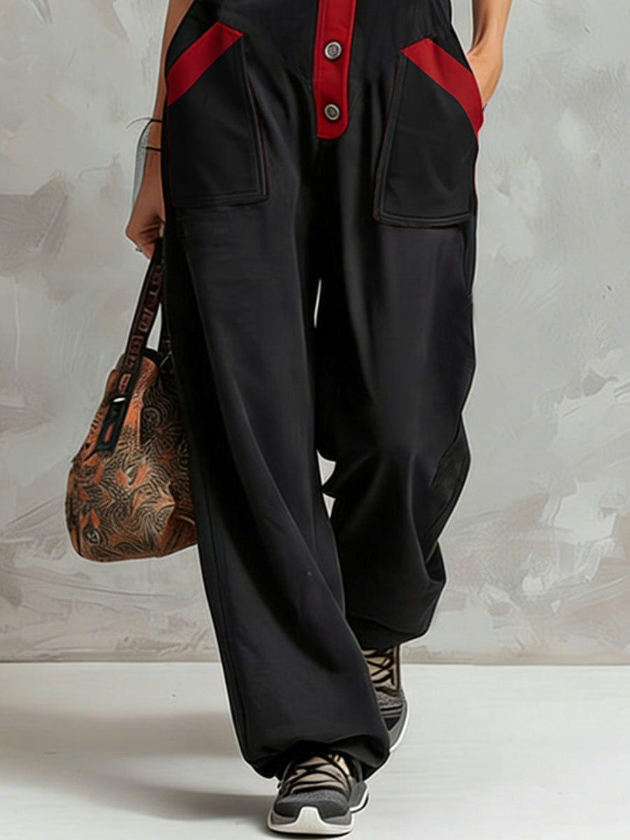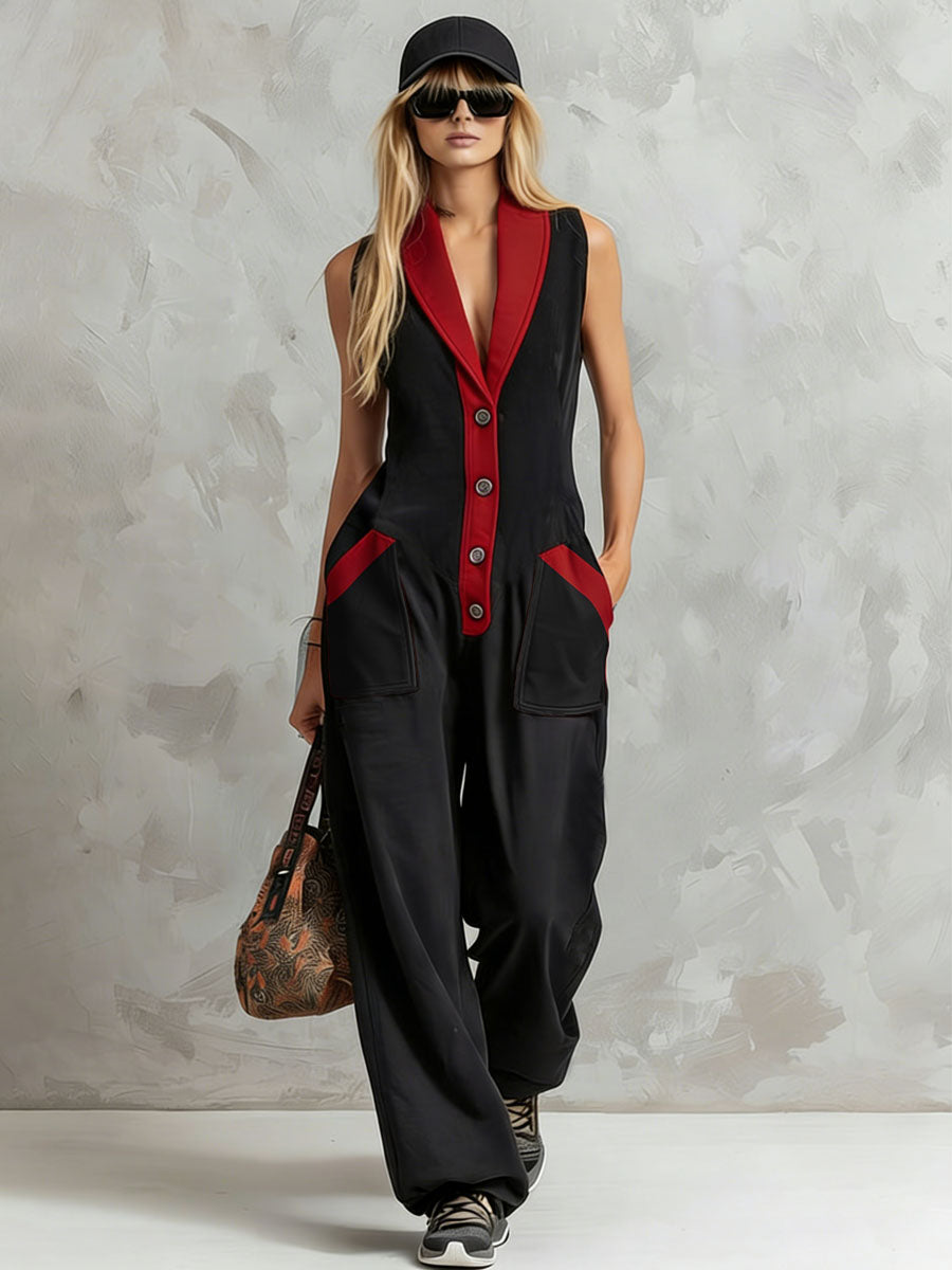 Shawl-neck Color-blocked Sleeveless Jumpsuit