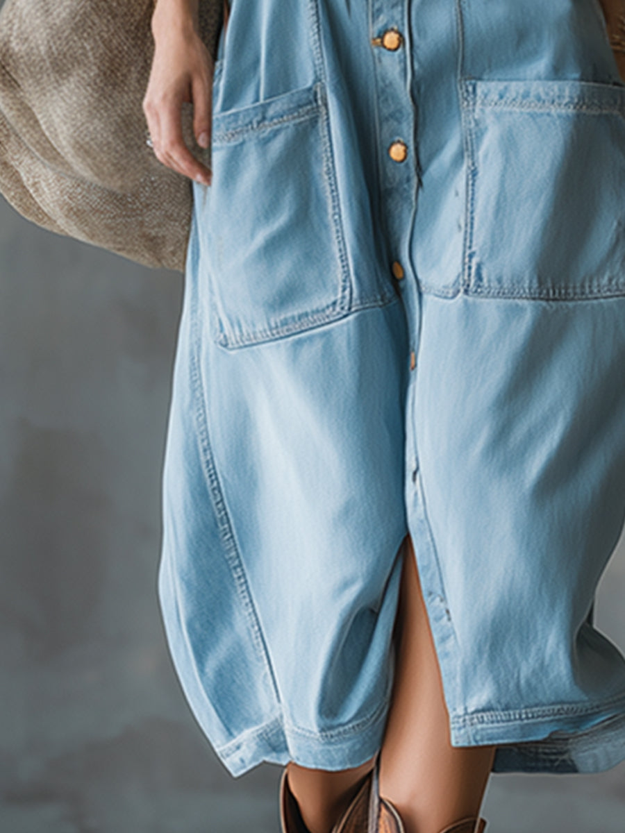 This denim midi dress is a versatile wardrobe essential, perfectly balancing vintage charm with modern elegance. The square neckline, front button details, and sleeveless design make it suitable for various occasions and seasons. It's a practical and stylish choice for anyone looking to add a classic denim piece to their wardrobe.