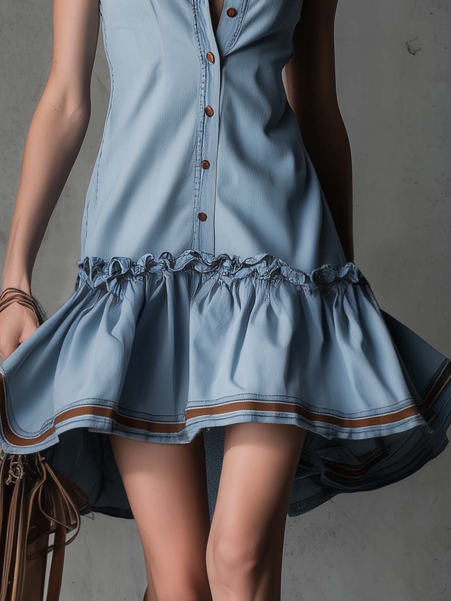 Vintage Western Elegance Lapel Front Buttons And Ruffled Hem Light Blue Denim Mini Dress