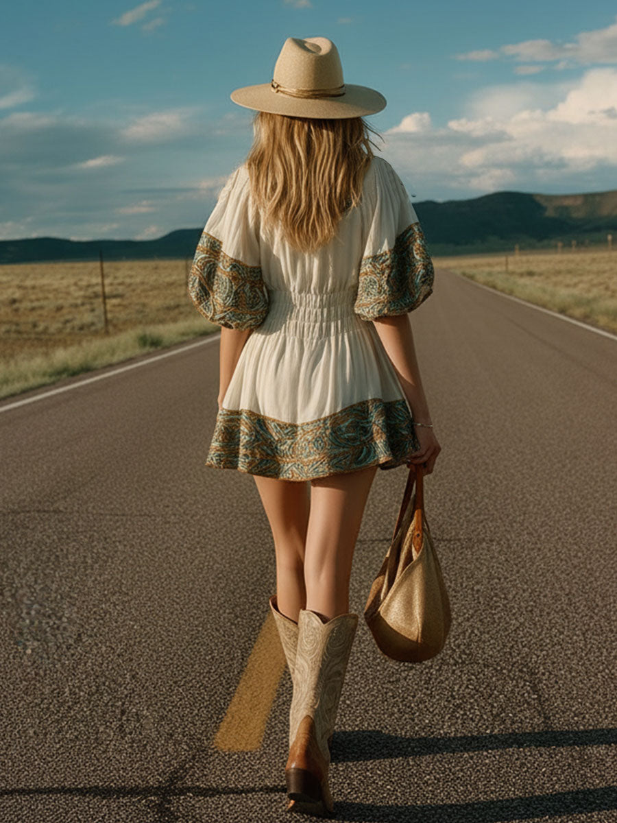 Crafted from lightweight chiffon, this mini dress offers a breezy and comfortable fit, perfect for warm days or festive gatherings. The ruffled details not only accentuate the neckline but also add a dynamic element to the overall silhouette, enhancing its retro appeal. This dress is ideal for those who appreciate a blend of Western and ethnic influences, offering a unique style that stands out. Pair it with cowboy boots for a Western-inspired look or with sandals for a more laid-back, bohemian feel. Whether for a summer outing or a casual evening event, this dress promises to make a stylish statement.