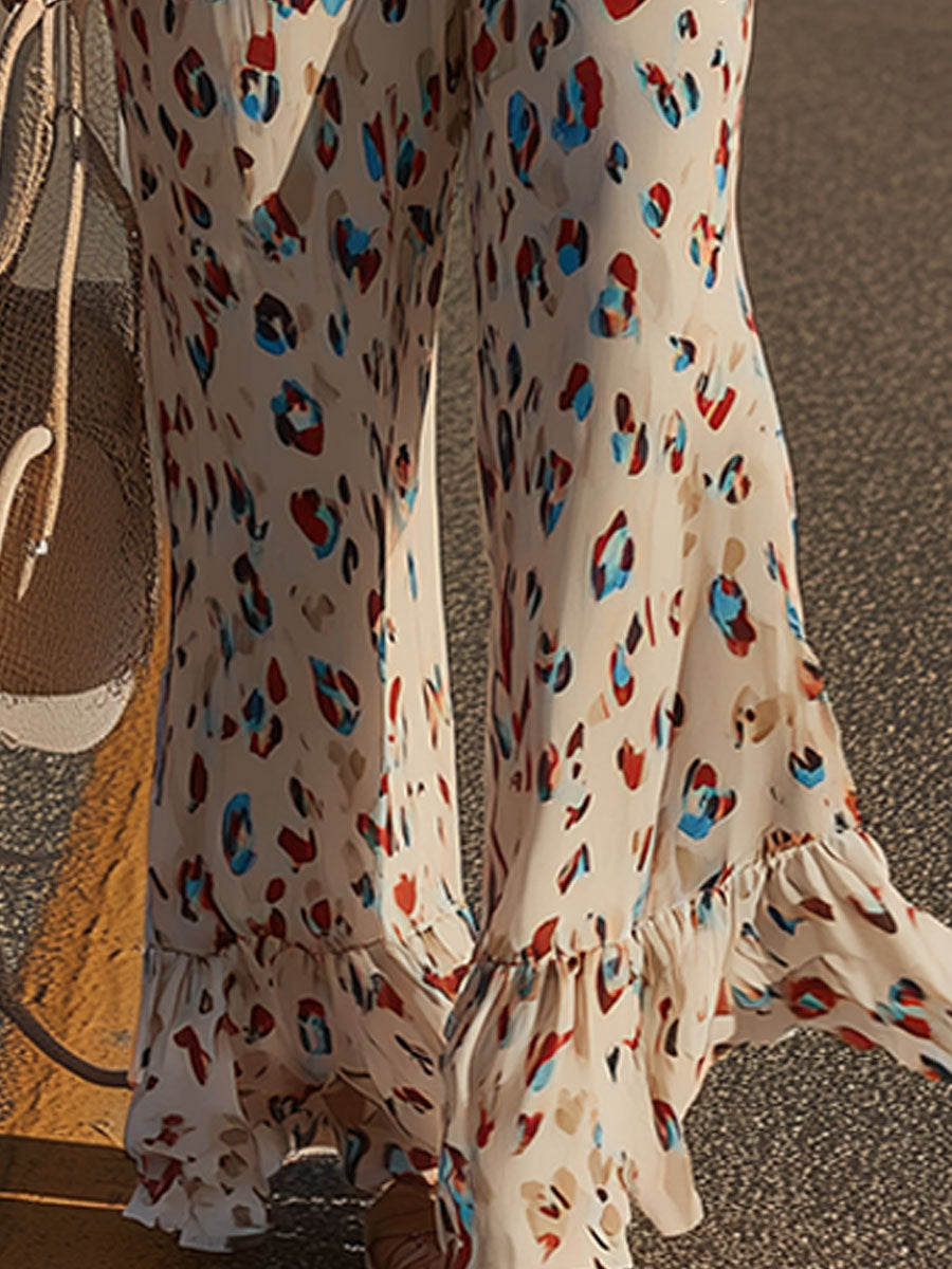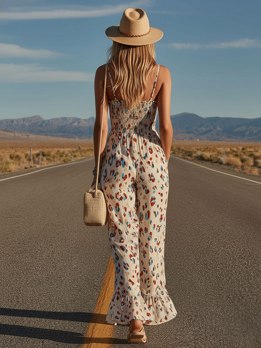 Western Retro Leopard Print White Ruffled Square Neck Chiffon Jumpsuit