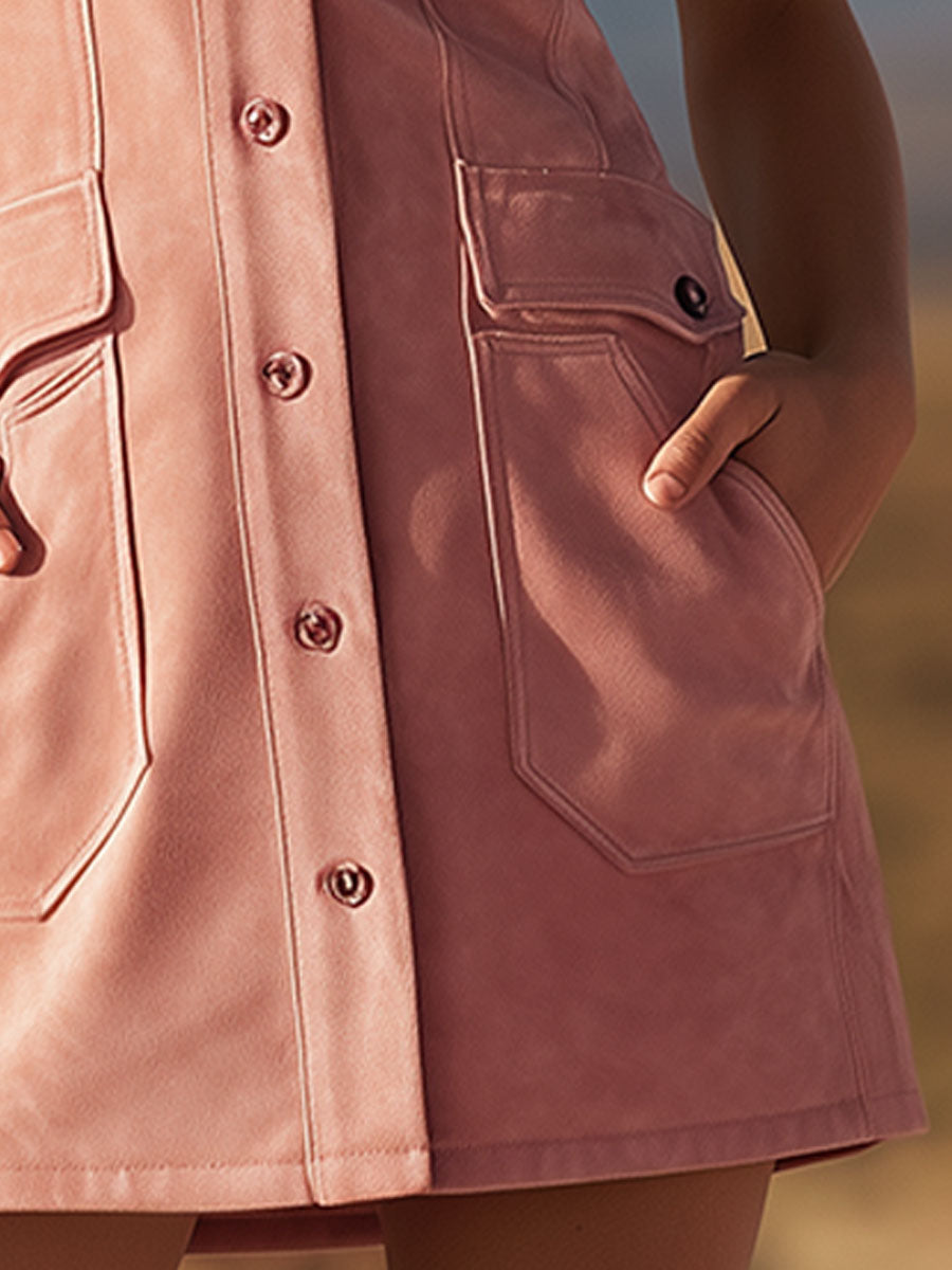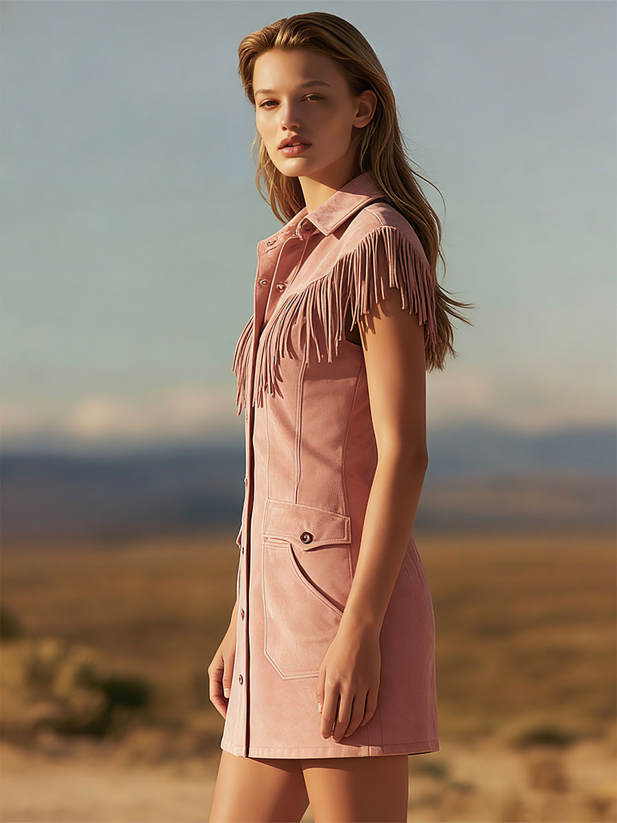 Western Retro Pink Fringed Collar Button-down Mini Dress