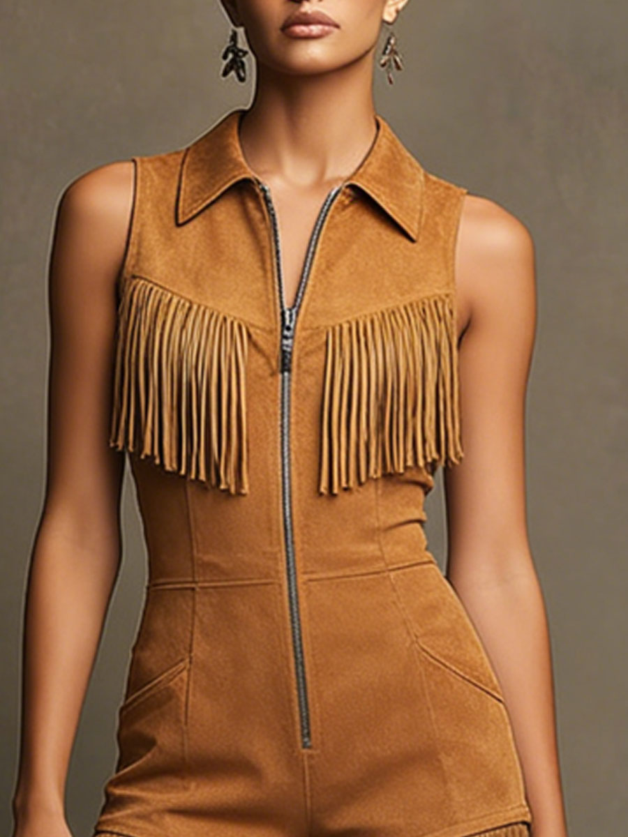 Western Retro Sleeveless Caramel Faux Suede Fringe Shorts Jumpsuit