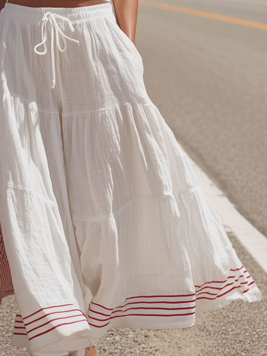 Paired with the top is a white cotton-linen skirt, which adds an element of breezy elegance to the ensemble. The skirt's natural fibers ensure breathability and comfort, while its classic A-line or slightly flared cut offers a graceful silhouette that complements the fitted top. The combination of cotton and linen gives the skirt a lightweight feel, perfect for casual outings or relaxed gatherings. Together, the set embodies a Western retro aesthetic that is both relaxed and refined. Accessorize with a wide-brimmed hat and sandals for a laid-back daytime look, or add a belt and ankle boots for a more polished appearance, making this set a versatile addition to any wardrobe.