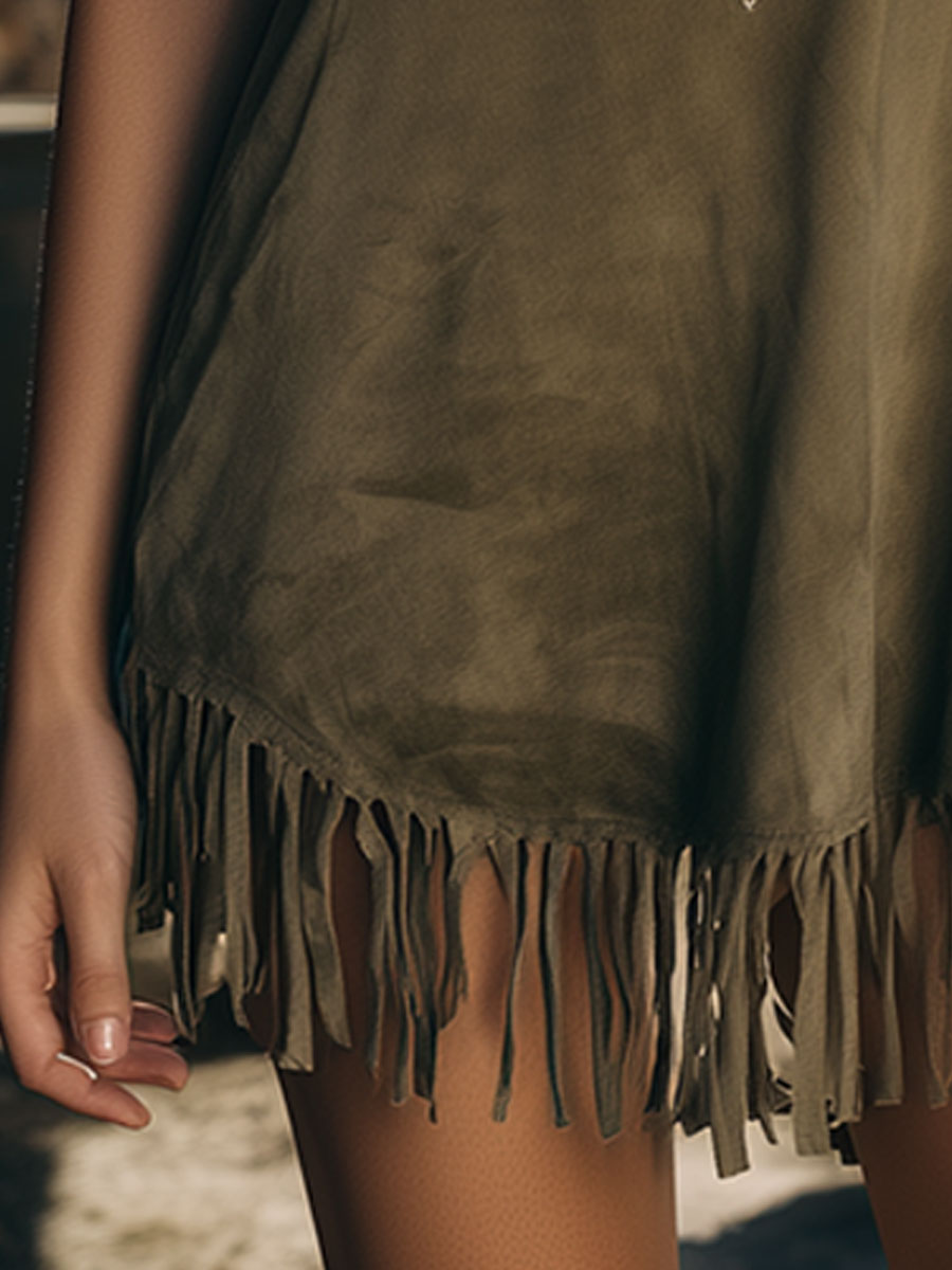 Western-style Retro Embroidered Tassel Olive Green Sleeveless Faux Suede Mini Dress